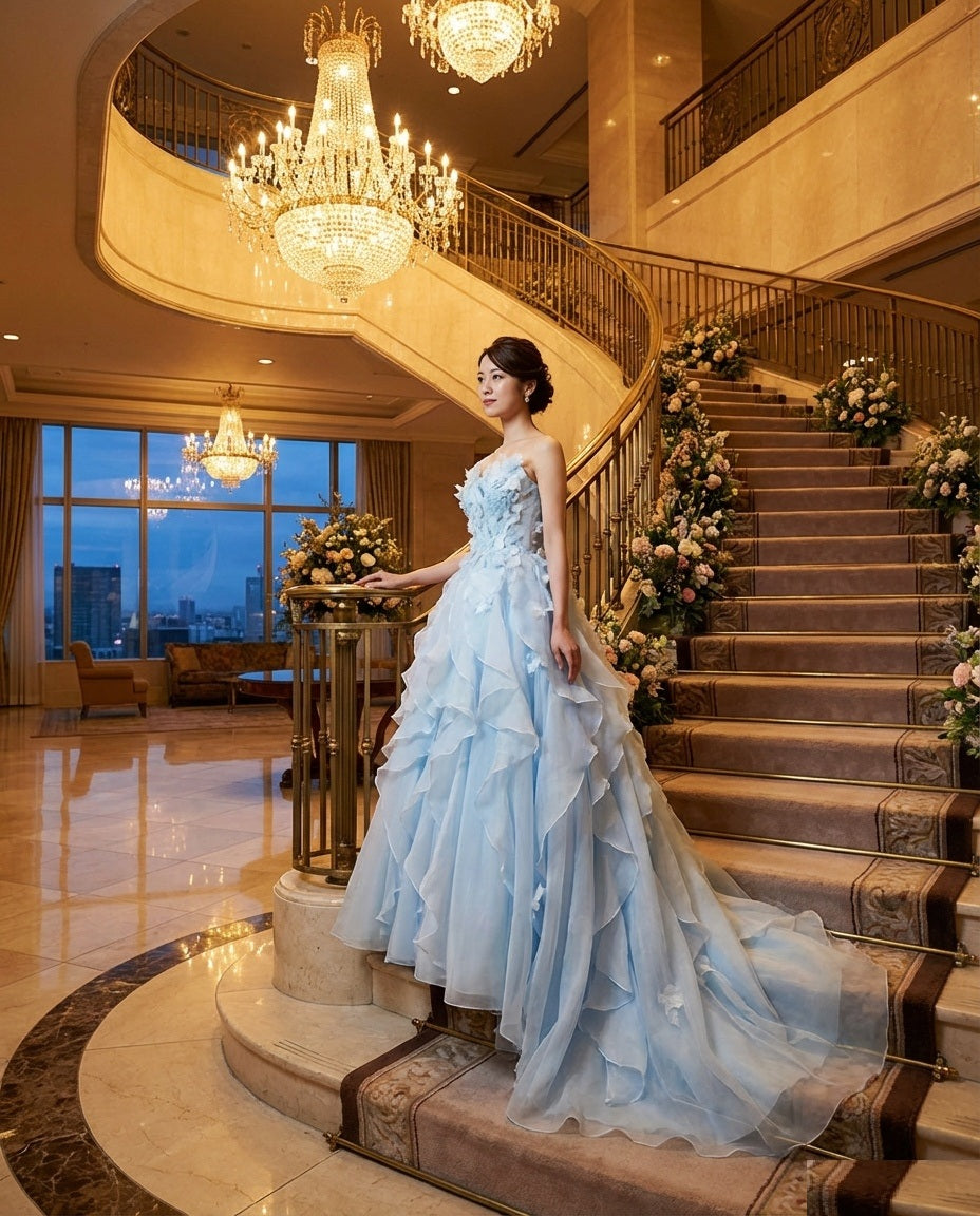 amara Aラインドレス (着丈 サイズオーダー可能) ロングドレス ノースリーブドレス オーダーメイド 高級ドレス パーティードレス 演奏会ドレス 結婚式ドレス フォーマル 楽天人気 チュールドレス ビジュー装飾 透明感 上質感 気品 クラシック 大人女性 ホテル大階段 シャンデリア光 後ろ姿美人 主役級存在感 特別な夜 写真映え 美しさ最大化(ブルー)