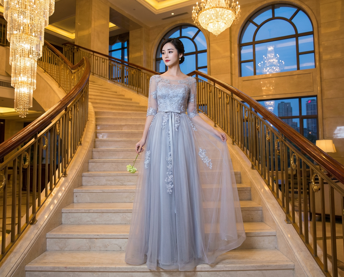 Celina ロングドレス (着丈 サイズオーダー可能) オーダーメイド Aラインドレス パーティードレス フォーマルドレス 高級ドレス ノースリーブドレス グレードレス シフォン素材 透明感 大人女性 ラグジュアリーホテル 大階段 シャンデリア光 柔光ライティング 気品 特別な夜 (グレー)