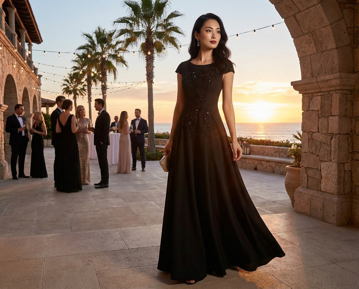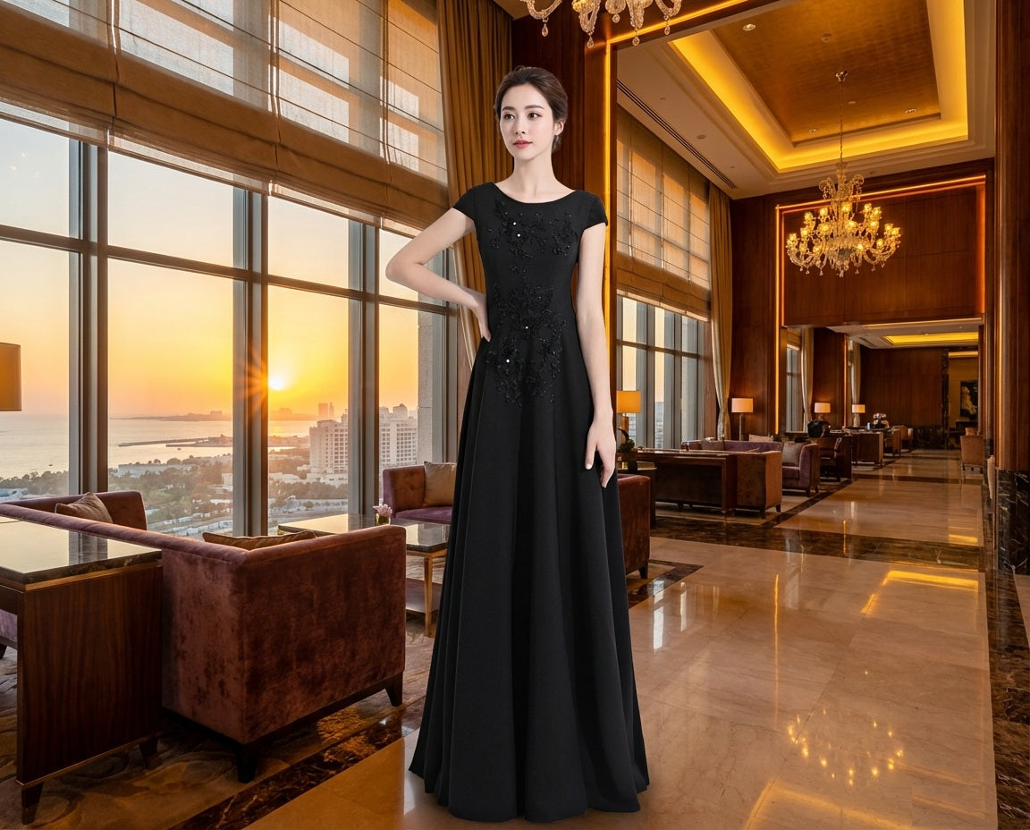 Sara オーダーメイド ロングドレス ノースリーブ Aライン ビジュー 晩餐会 静かな美しさ 特別の一日 (ブラック)