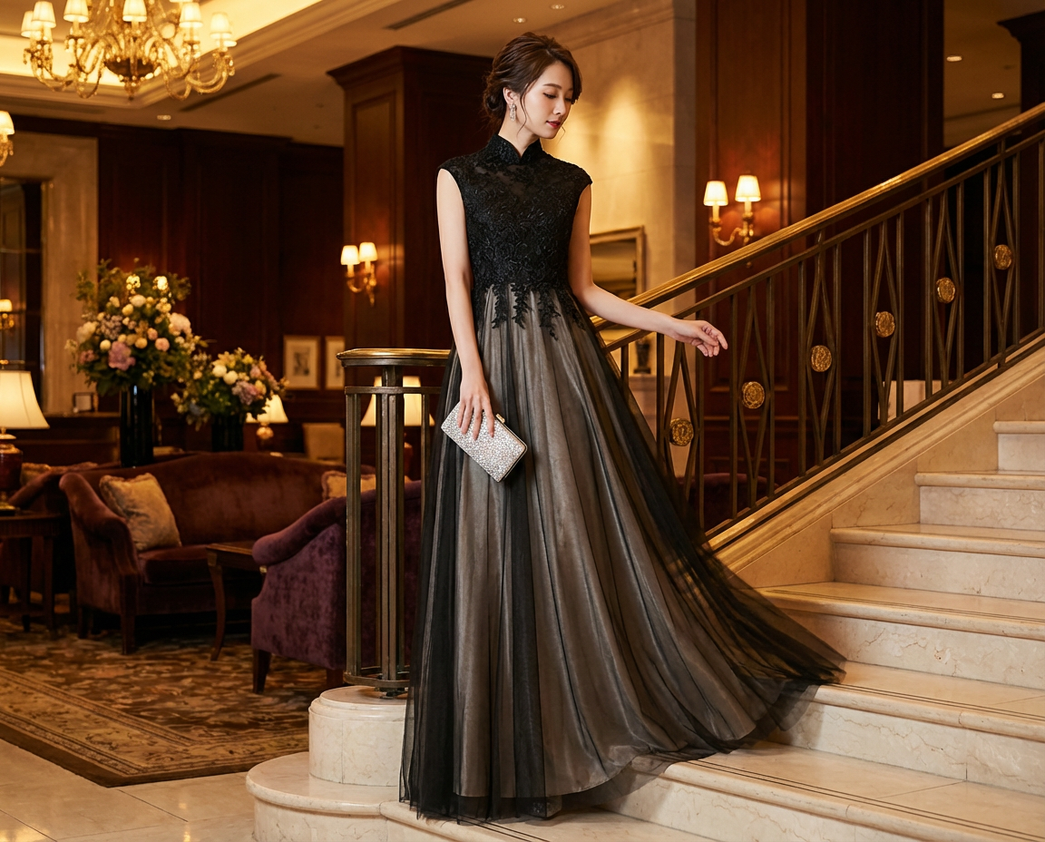Amelia Aラインドレス ブラック ハイネックレース グラデーションロング 優雅シルエット オーダーメイド(ブラック)