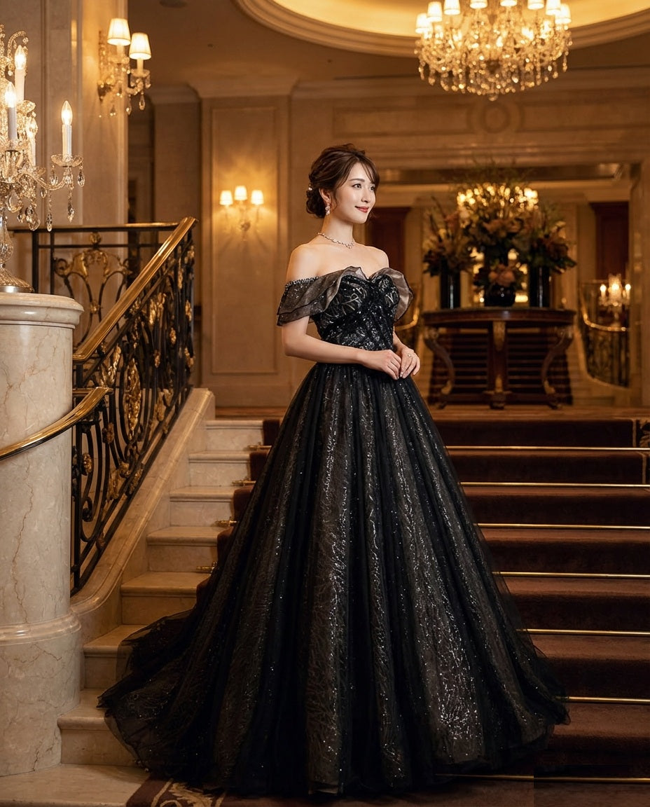 jenifer (着丈 サイズオーダー可能) Aラインドレス オーダーメイド 高級ドレス ロングドレス ボリュームドレス ブラックドレス ストラップレス ベアトップ ビジュードレス ジャカード 刺繍 繊細 気品 圧倒的存在感 大人女性 ホテルウェディング シャンデリア 階段演出 ナイトパーティー 主役級 美シルエット 日本人女性向け 高見え 楽天人気 フォーマルドレス 演奏会 発表会 (ブラック)XS S M L XL XXL XXXL