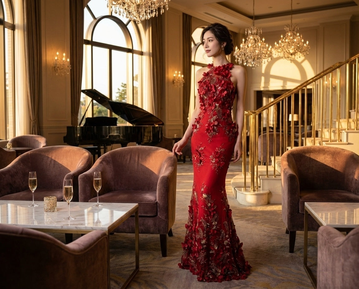 アルカドレスは、職人が一点一点真心を込めて丁寧に制作いたします。その想いは素材選びから縫製、装飾まで、すべての工程に宿ります。世界に一つだけの特別な一着を、ぜひご自身の目で、肌で感じてください。また、追加料金1,500円で、丈の長さ・胸囲・ウエストなど、お客様のサイズに合わせたオーダーメイドも承っております。