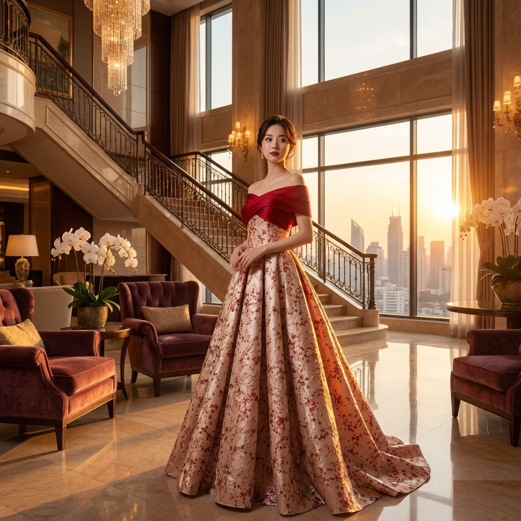 Pablo Aラインドレス (着丈 サイズオーダー可能) ロングドレス オーダーメイド ノースリーブドレス レースドレス ビジュー 刺繍 チュール グラデーション 高級ドレス ラグジュアリードレス パーティードレス 結婚式 演奏会 披露宴 ホテルロビー サンセット 夕陽差し込む空間 気品 優雅 大人の余裕 日本人女性 体型美 シルエット美 主役級存在感 特別な夜 (レッド)