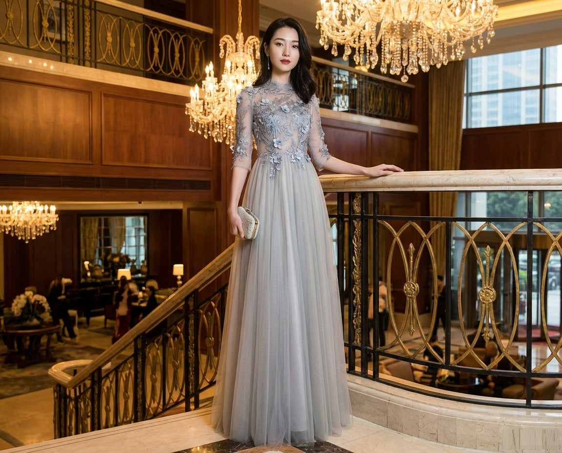Celina ロングドレス (着丈 サイズオーダー可能) オーダーメイド Aラインドレス パーティードレス フォーマルドレス 高級ドレス ノースリーブドレス グレードレス シフォン素材 透明感 大人女性 ラグジュアリーホテル 大階段 シャンデリア光 柔光ライティング 気品 特別な夜 (グレー)