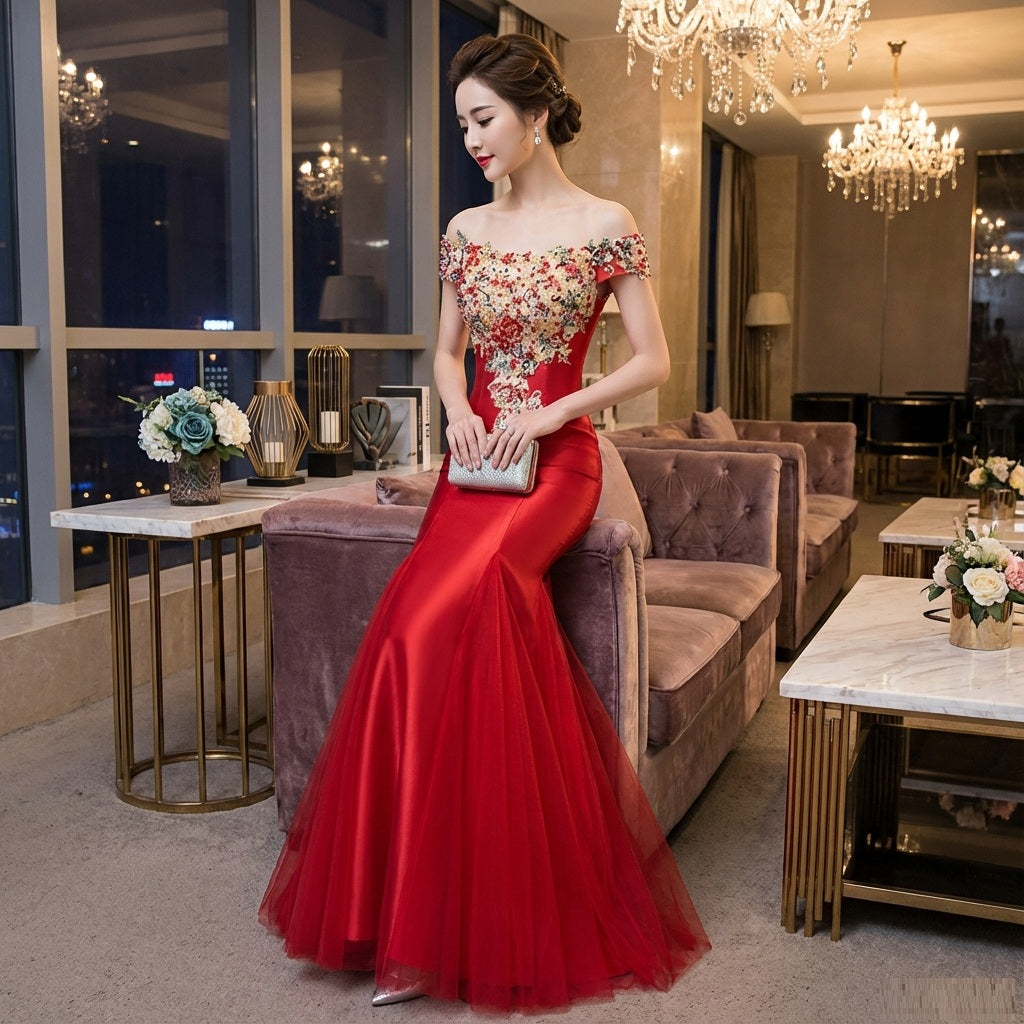 riccardo (着丈 サイズオーダー可能) オーダーメイド マーメイドドレス フィッシュテールドレス ロングドレス レッドドレス レースドレス ビジュードレス フォーマルドレス 高級ドレス 上質素材 華やぎ 情熱 気品 大人女性 美シルエット 体型補整 ホテルラウンジ 夜景 映える装い 結婚式 二次会 演奏会 特別な夜 ラグジュアリー (レッド)XS S M L XL XXL XXXL