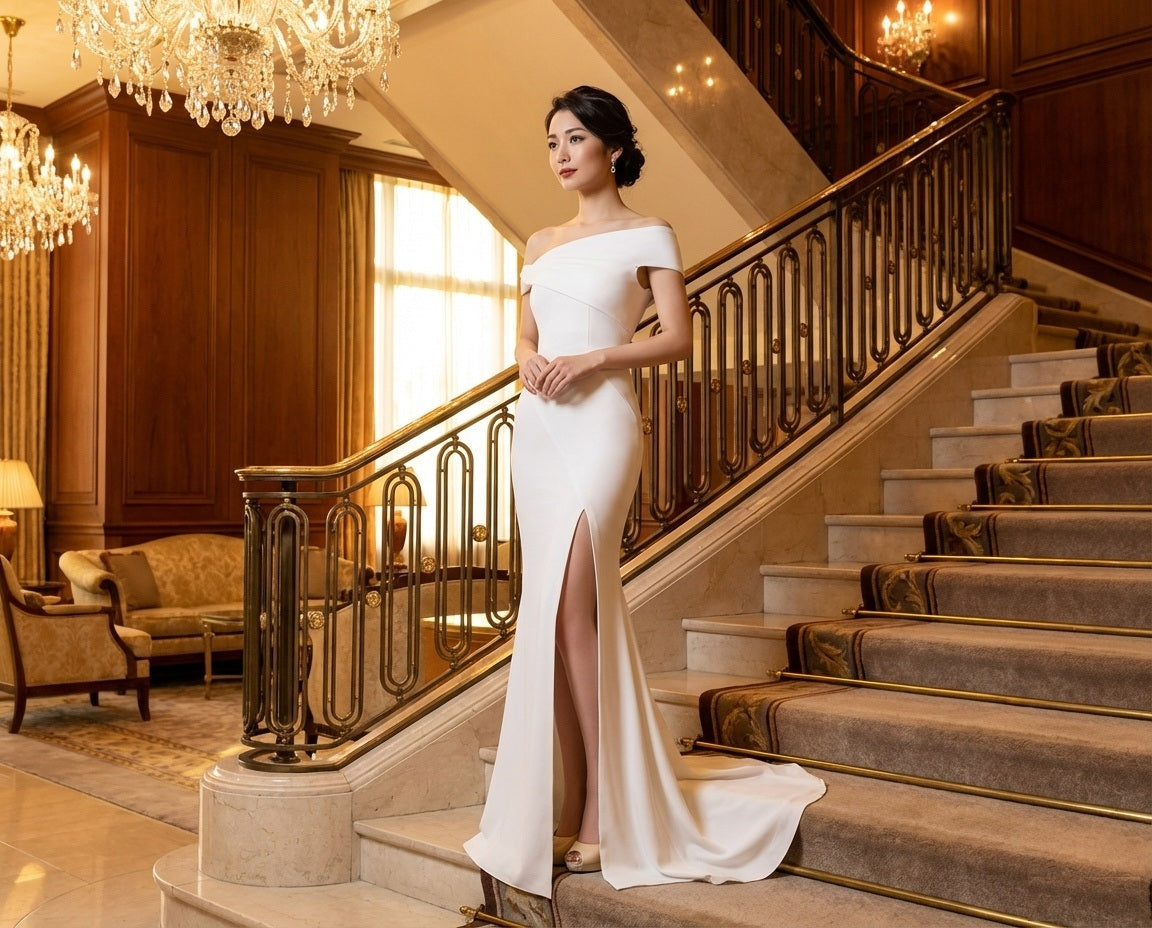 sibilleblue (着丈 サイズオーダー可能) マーメイドドレス ロングドレス ノースリーブドレス オーダーメイド 高級ドレス ホワイトドレス フォーマルドレス パーティードレス 結婚式 演奏会 二次会 宮殿ホテル 大階段 ゴールド照明 上質素材 サテンドレープ トレーン 曲線美 美シルエット 大人女性 気品 透明感 女神 主役級存在感 日本人女性 (ホワイト)XS S M L XL XXL XXXL
