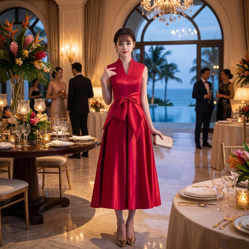 Luna Aラインドレス (着丈 サイズオーダー可能) オーダーメイド ロングドレス ノースリーブドレス ウエストリボンドレス 上質サテン 高級感 ラグジュアリー 体型補整 美シルエット 大人上品 ホテルディナー フォーマルドレス 結婚式 パーティー 二次会 特別な夜 幸福感あふれる装い (レッド)XS S M L XL XXL XXXL