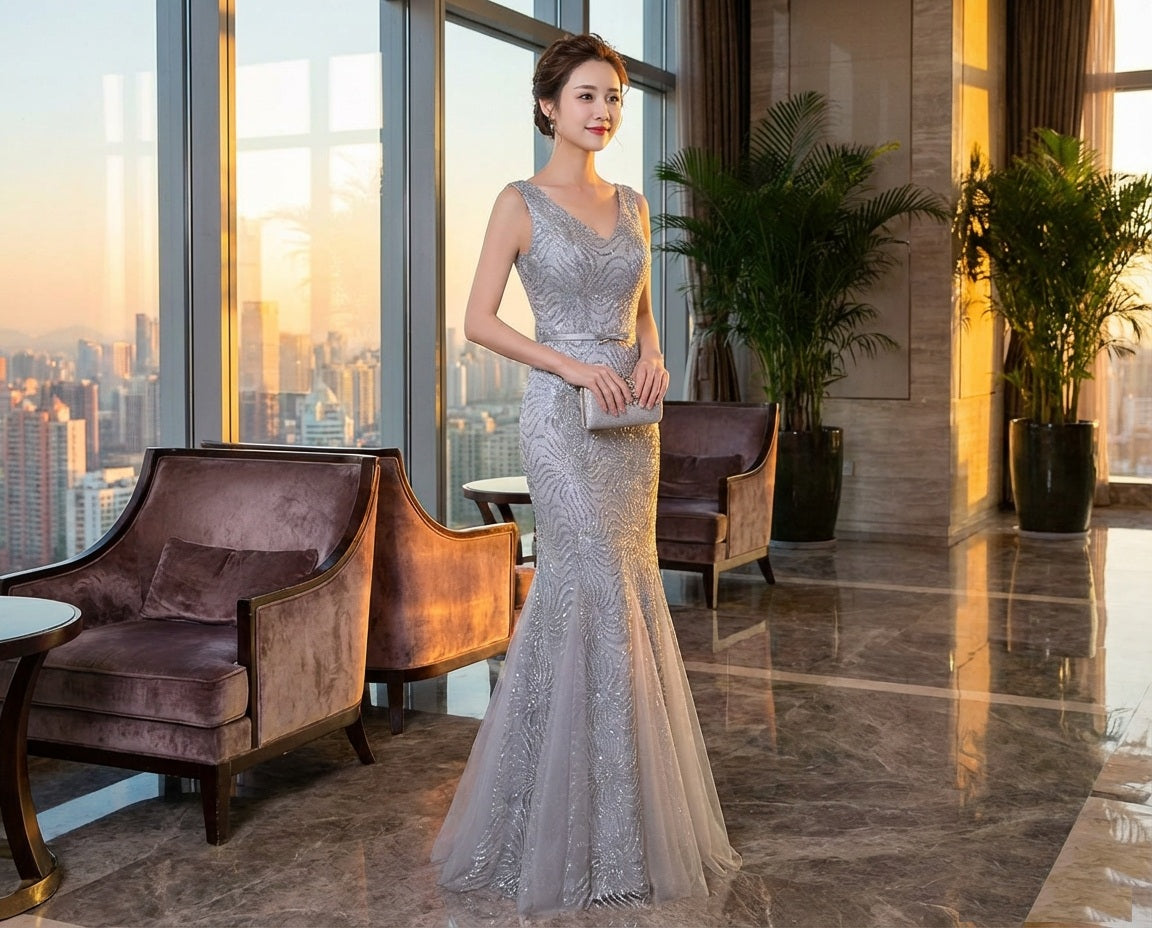 Celina ロングドレス (着丈 サイズオーダー可能) オーダーメイド Aラインドレス パーティードレス フォーマルドレス 高級ドレス ノースリーブドレス グレードレス シフォン素材 透明感 大人女性 ラグジュアリーホテル 大階段 シャンデリア光 柔光ライティング 気品 特別な夜 (グレー)