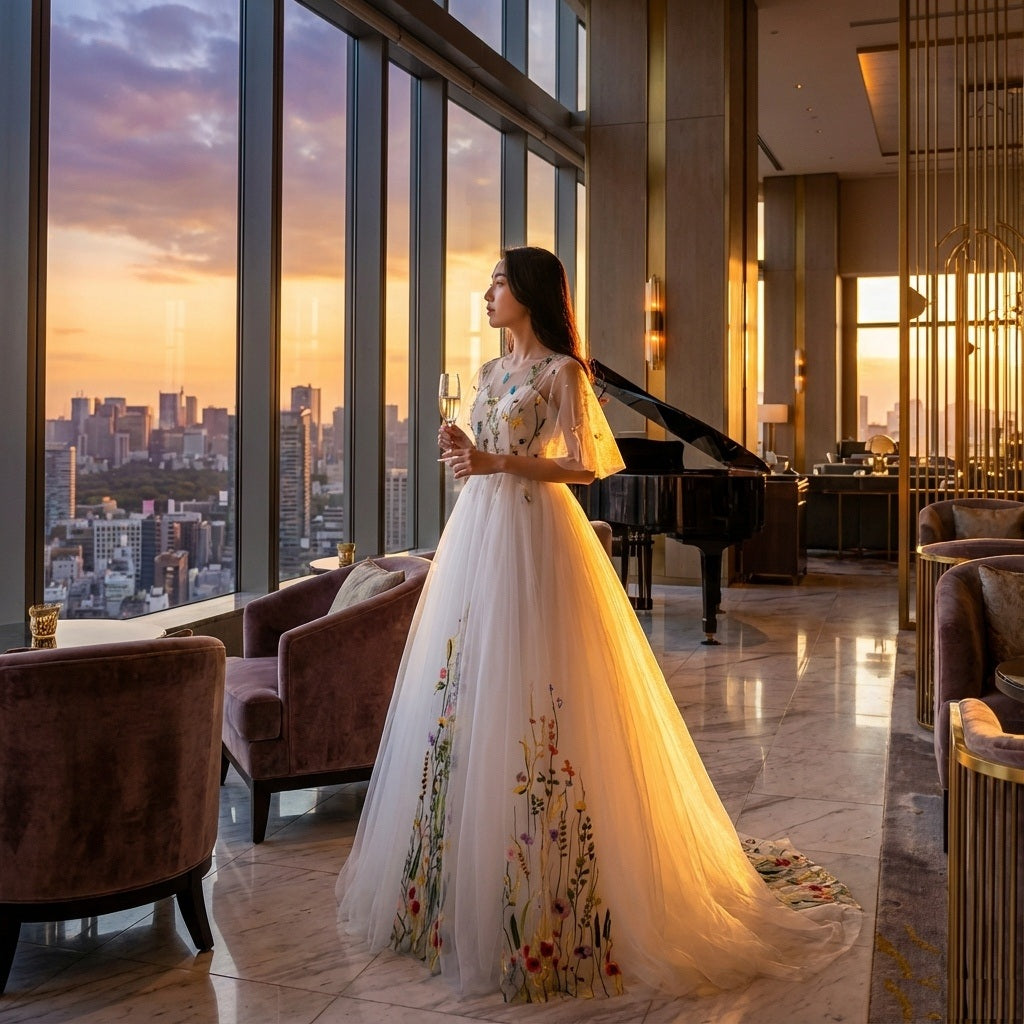 アルカドレスは、職人が一点一点真心を込めて丁寧に制作いたします。その想いは素材選びから縫製、装飾まで、すべての工程に宿ります。世界に一つだけの特別な一着を、ぜひご自身の目で、肌で感じてください。また、追加料金1,500円で、丈の長さ・胸囲・ウエストなど、お客様のサイズに合わせたオーダーメイドも承っております。