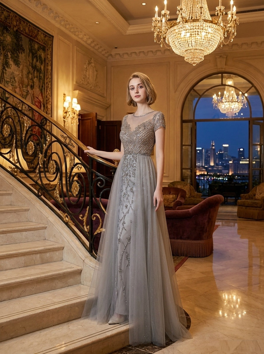 Celina ロングドレス (着丈 サイズオーダー可能) オーダーメイド Aラインドレス パーティードレス フォーマルドレス 高級ドレス ノースリーブドレス グレードレス シフォン素材 透明感 大人女性 ラグジュアリーホテル 大階段 シャンデリア光 柔光ライティング 気品 特別な夜 (グレー)