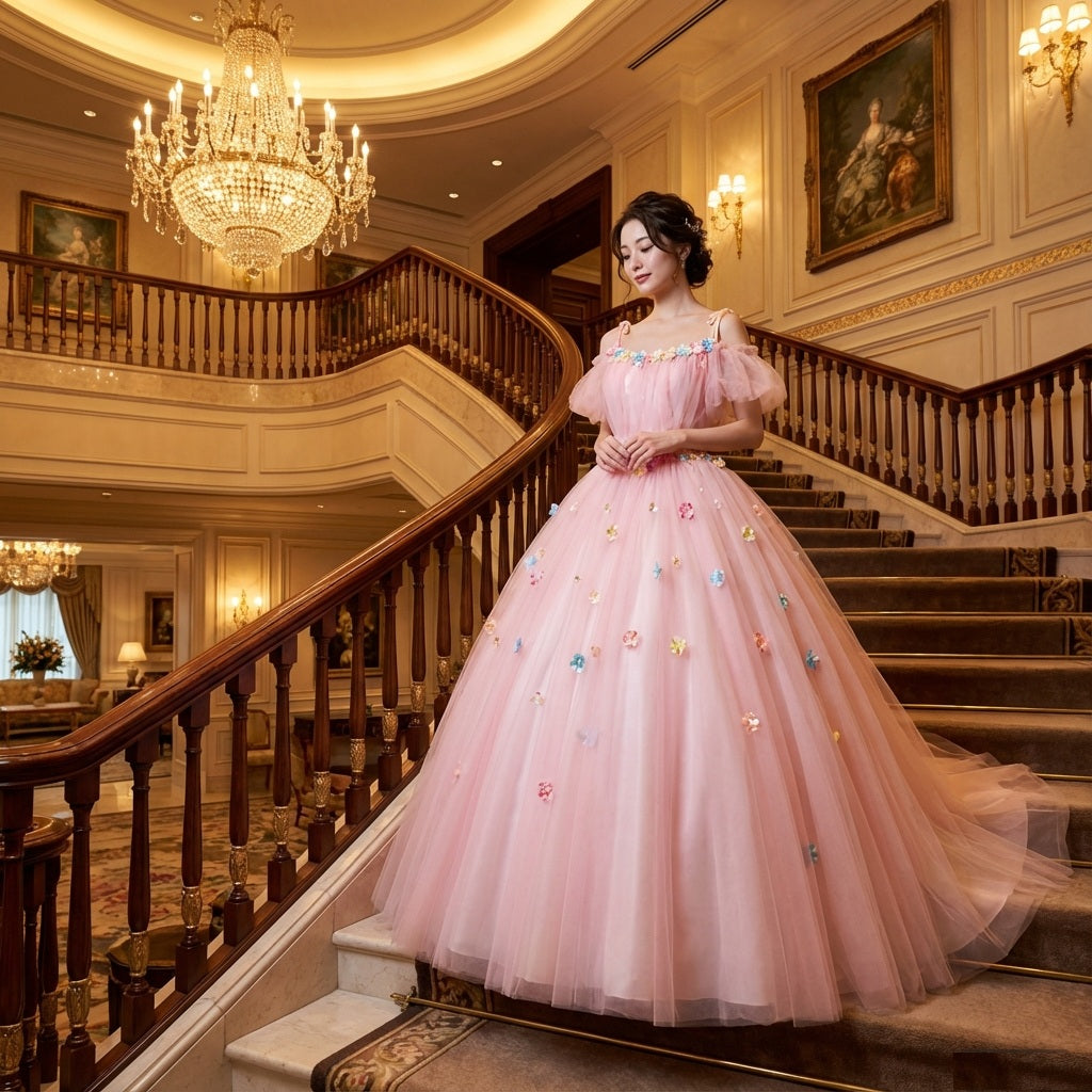 alice (着丈 サイズオーダー可能) Aラインドレス ロングドレス オーダーメイド ピンク プリンセスドレス チュールドレス ボリュームスカート 立体フラワー装飾 半袖風デザイン 揺れ感 透明感 圧倒的可憐 気品 ロマンティック モデル佇まい ホテル大階段 シャンデリア 特別な一日 フォーマル パーティー 上質ラグジュアリードレス (ピンク)XS S M L XL XXL XXXL
