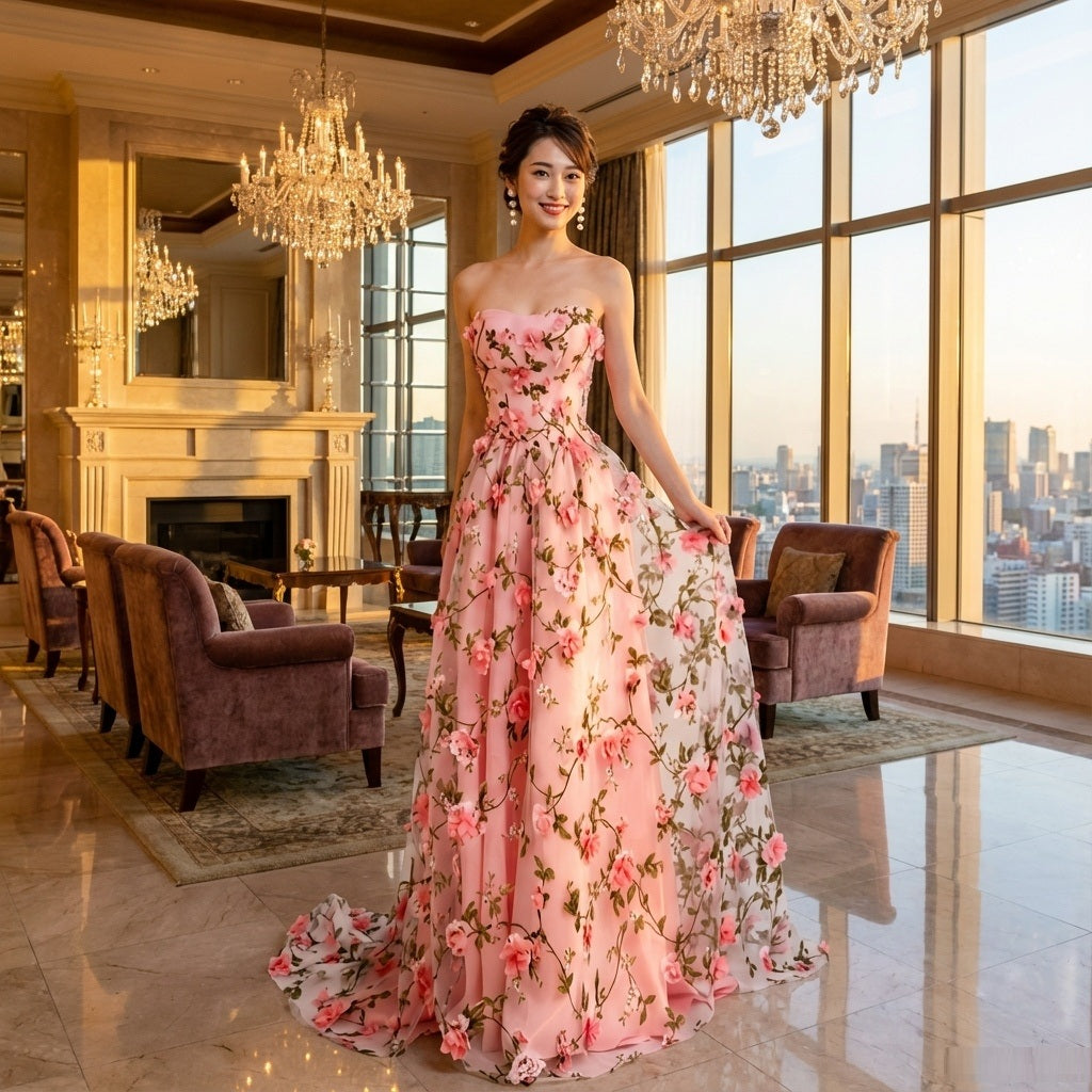 augier (着丈 サイズオーダー可能) オーダーメイド ロングドレス Aラインドレス レースドレス ノースリーブドレス ピンクドレス フォーマルドレス 上質素材 総レース フローラル模様 フレアシルエット 透明感 可憐 気品 大人女性 正装 結婚式 披露宴 演奏会 二次会 パーティー 高級感 日本人女性向け (ピンク)XS S M L XL XXL XXXL
