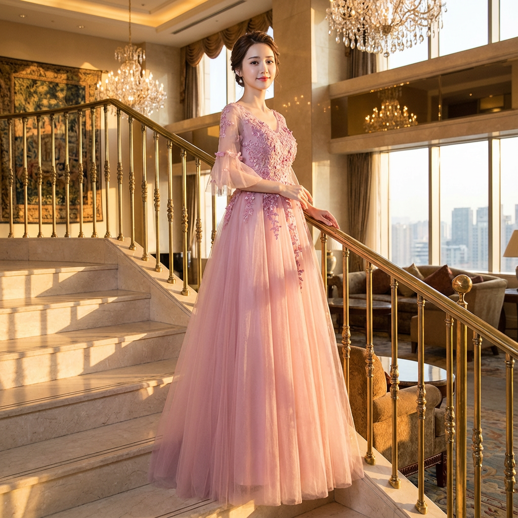 autin Aラインドドレス (着丈 サイズオーダー可能) オーダーメイド Aラインドレス ロングドレス レースドレス ノースリーブドレス ピンクドレス フォーマルドレス 上質素材 繊細レース ダスティローズ エアリーシルエット 透明感 気品 美シルエット 柔らかな光 大人女性 正装 結婚式 披露宴 演奏会 晩餐会 パーティー 高級感 日本人女性向け (ピンク)XS S M L XL XXL XXXL