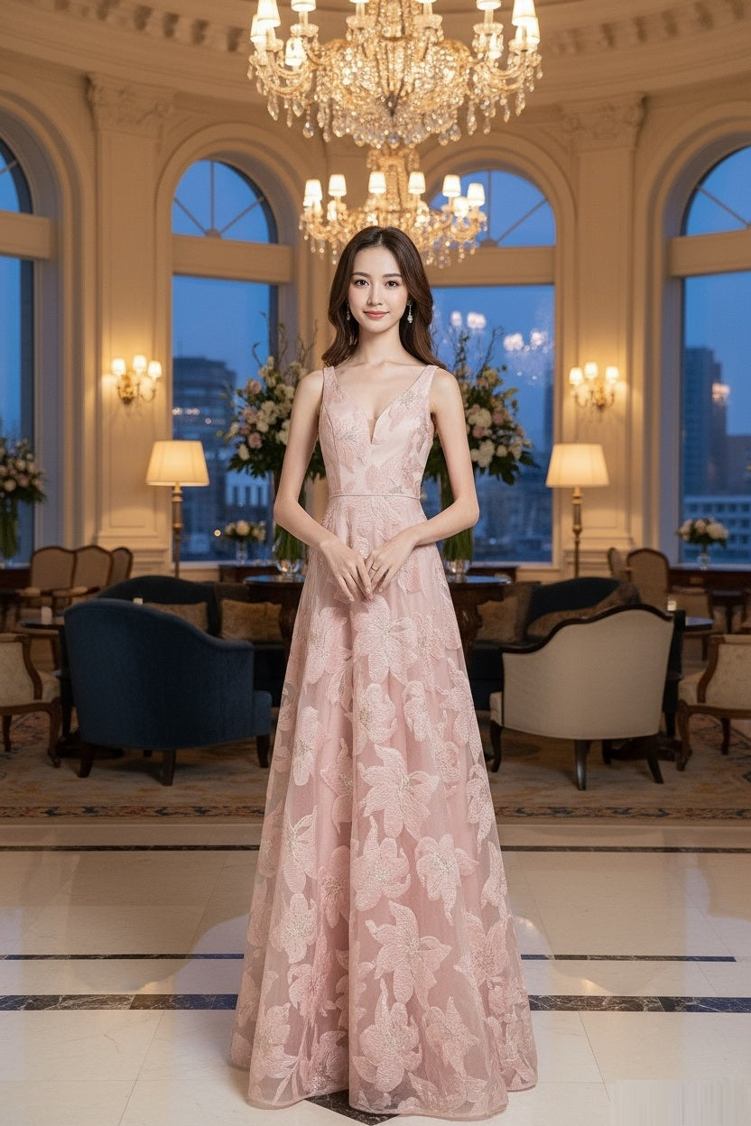 Celina ロングドレス (着丈 サイズオーダー可能) オーダーメイド Aラインドレス パーティードレス フォーマルドレス 高級ドレス ノースリーブドレス グレードレス シフォン素材 透明感 大人女性 ラグジュアリーホテル 大階段 シャンデリア光 柔光ライティング 気品 特別な夜 (グレー)