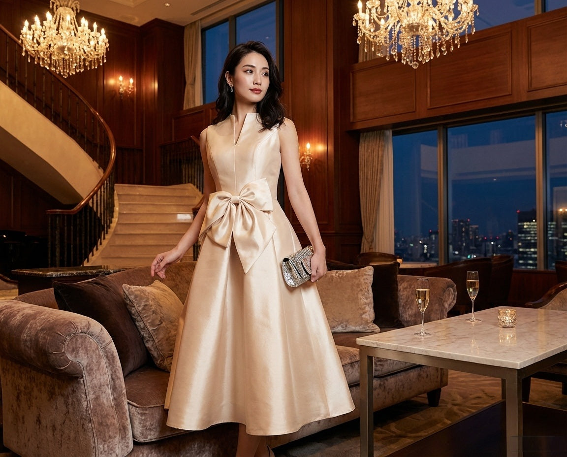 elba(着丈 サイズオーダー可能) Aラインドレス オーダーメイド ロングドレス ノースリーブドレス ベージュドレス 上質サテン 微光沢 ハリ感素材 ウエストリボン 体型補整 美シルエット ホテルラウンジ シャンデリア 夜景 気品 知的 大人女性 ラグジュアリー フォーマル 結婚式 演奏会 パーティー 特別な夜 (ベージュ)