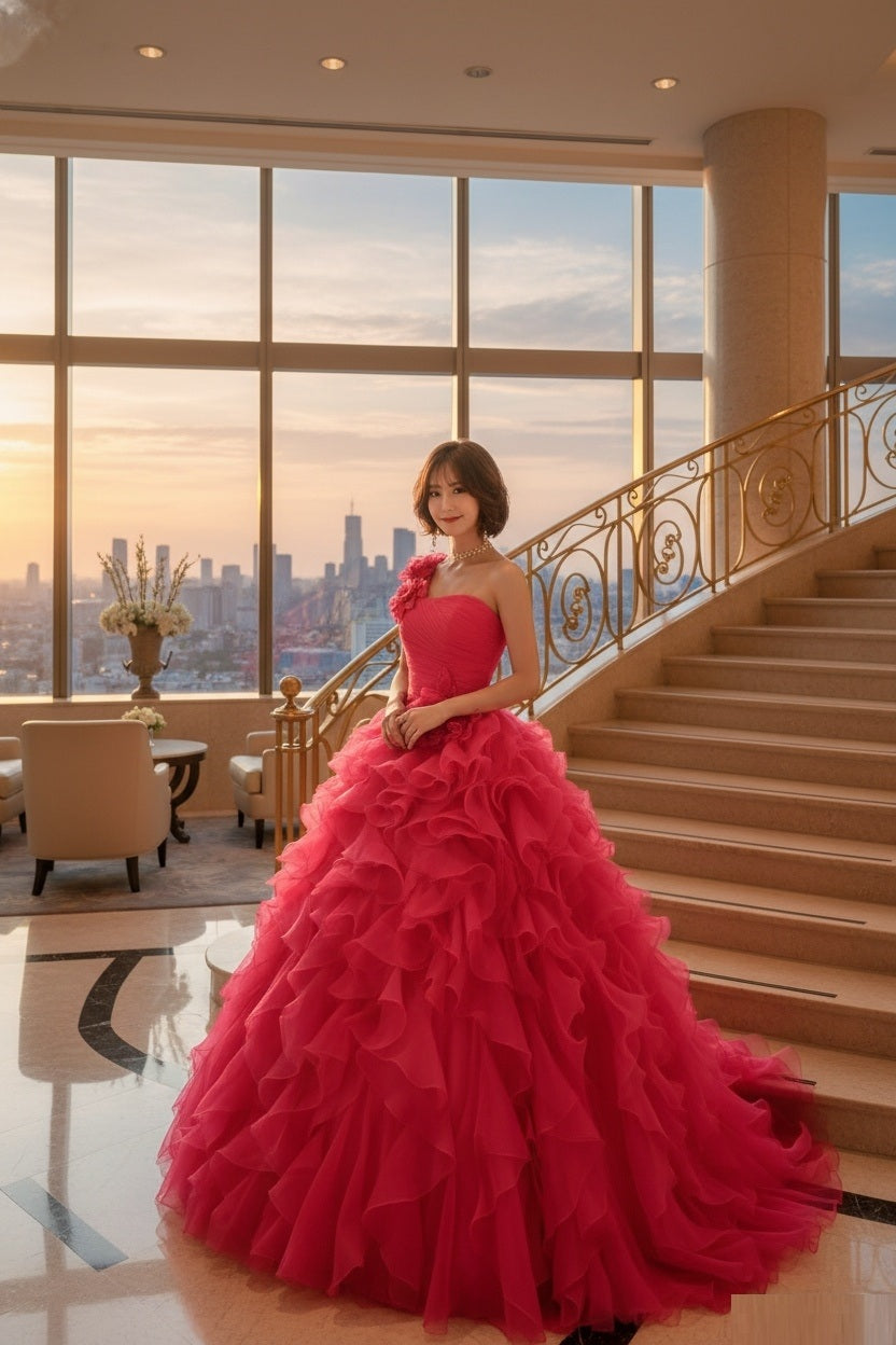 Eleonor (着丈 サイズオーダー可能) Aラインドレス ロングドレス ノースリーブドレス オーダーメイド 高級ドレス レッドドレス フォーマルドレス パーティードレス 結婚式 演奏会 二次会 高級ホテル 大階段 夕景光 チュール フリル 多層スカート 上質素材 ボリューム 美シルエット 大人女性 気品 透明感 女王 主役級存在感 日本人女性 (レッド)