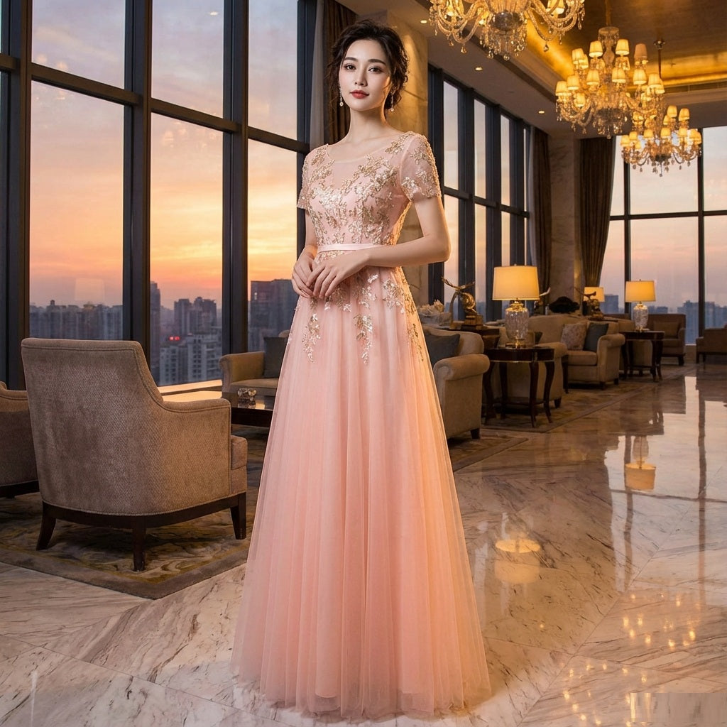 laurie (着丈 サイズオーダー可能) Aラインドレス ロングドレス シースルードレス オーダーメイド 高級 チュール レース 刺繍 フラワーモチーフ 立体装飾 ウエスト切替 美シルエット 透明感 気品 優雅 ホテルラウンジ 夕景 夜景ライティング 特別な夜 晩餐会 パーティー 結婚式 二次会 日本人女性 優しい微笑み 美しい瞬間 (ピンク)XS S M L XL XXL XXXL