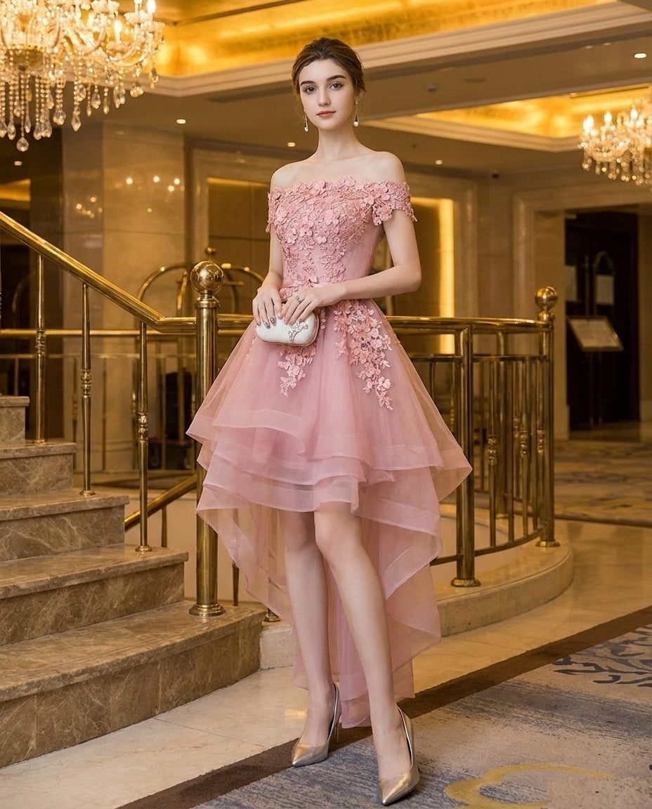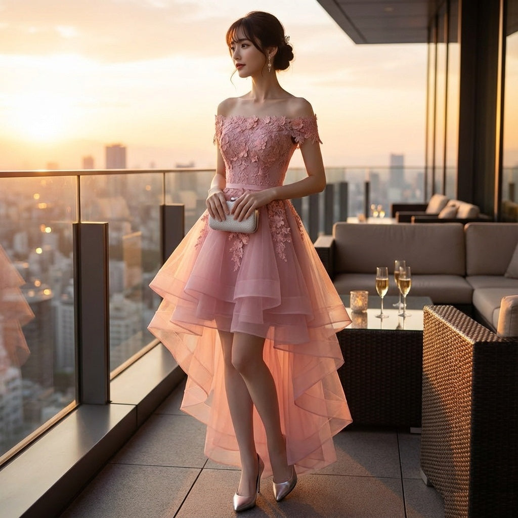 miia (着丈 サイズオーダー可能) Aラインドレス フィッシュテールドレス ノースリーブドレス オーダーメイド 高級 チュール レース フリル ティアード レイヤード シアー素材 前短後長 デザインドレス 美脚効果 立体シルエット 透明感 気品 フェアリーエレガンス サンセットテラス 都会夜景 特別な一日 パーティー 二次会 日本人女性 優雅に揺れる瞬間 (ピンク)XS S M L XL XXL XXXL