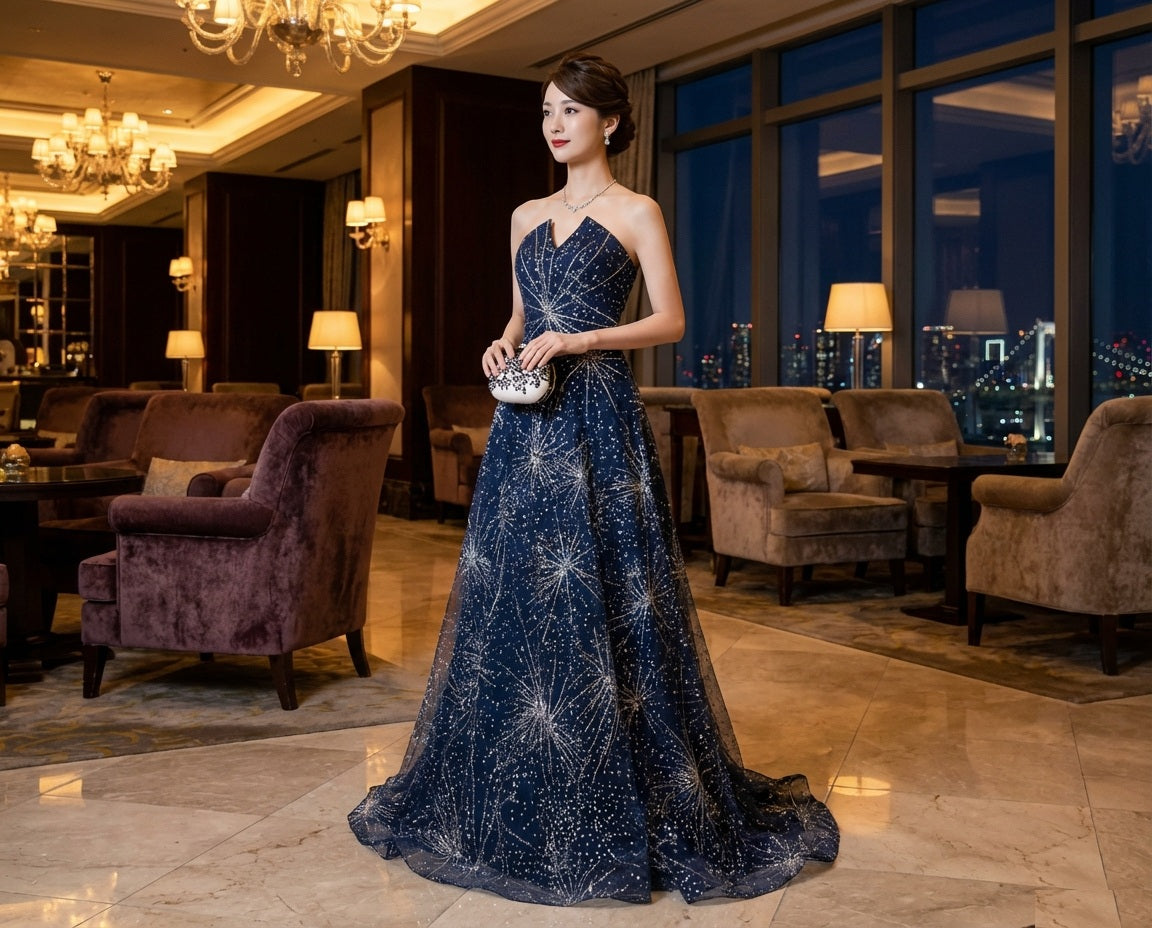 mimosa (着丈 サイズオーダー可能) マーメイドドレス ロングドレス ノースリーブドレス オーダーメイド 高級 ネイビードレス スパンコール レース ビジュー 総刺繍 フィットシルエット ボディライン強調 立体裁断 縦長効果 透明感 気品 クラシカルラグジュアリー 夜景ラウンジ ホテル照明 シャンデリア 特別な夜 晩餐会 ガラディナー 日本人女性 視線を奪う存在感 (ネイビー)XS S M L XL XXL XXXL