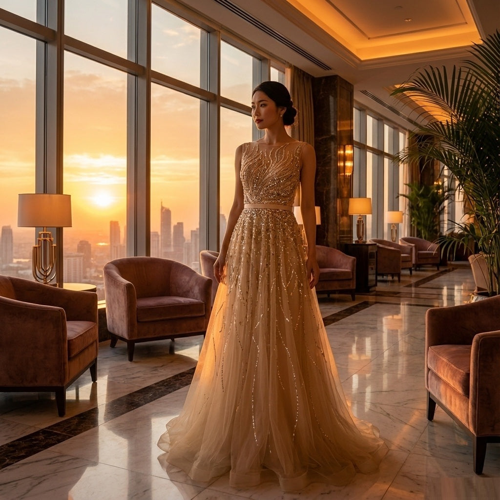 n1011 Aラインドレス (着丈 サイズオーダー可能) オーダーメイド ロングドレス ノースリーブドレス レースドレス チュールドレス シアー素材 微光沢 透明感 美シルエット ホテルラウンジ 夕景 サンセット光 気品 大人女性 ラグジュアリー フォーマル 結婚式 演奏会 パーティー 特別な夜 (ベージュ)
