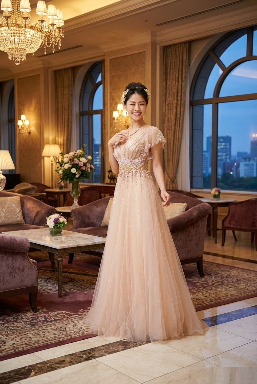 n2002 (着丈 サイズオーダー可能) Aラインドレス ロングドレス オーダーメイド 高級 アプリコット チュールドレス レース刺繍 シアースリーブ 透け感 ウエスト美ライン 軽やか 揺れ感 上品 清楚 大人フェミニン ホテルラウンジ 夜景照明 特別な夜 日本人女性 (アプリコット)XS S M L XL XXL XXXL