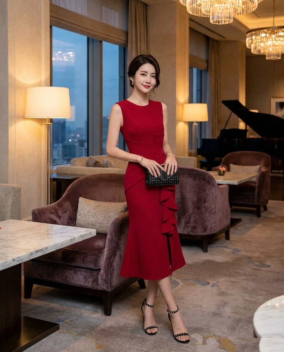 Isabella レッド スリットドレス タイトライン ノースリーブ 優雅シルエット オーダーメイド(レッド)