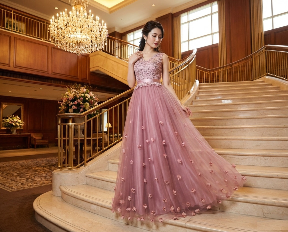 sarah (着丈 サイズオーダー可能) オーダーメイド Aラインドレス ロングドレス ピンク チュールドレス ビジュードレス スパンコール 繊細装飾 透明感 気品 日本人女性 美シルエット 体型補整 ホテル階段 特別な夜 フォーマル パーティー (ピンク)XS S M L XL XXL XXXL