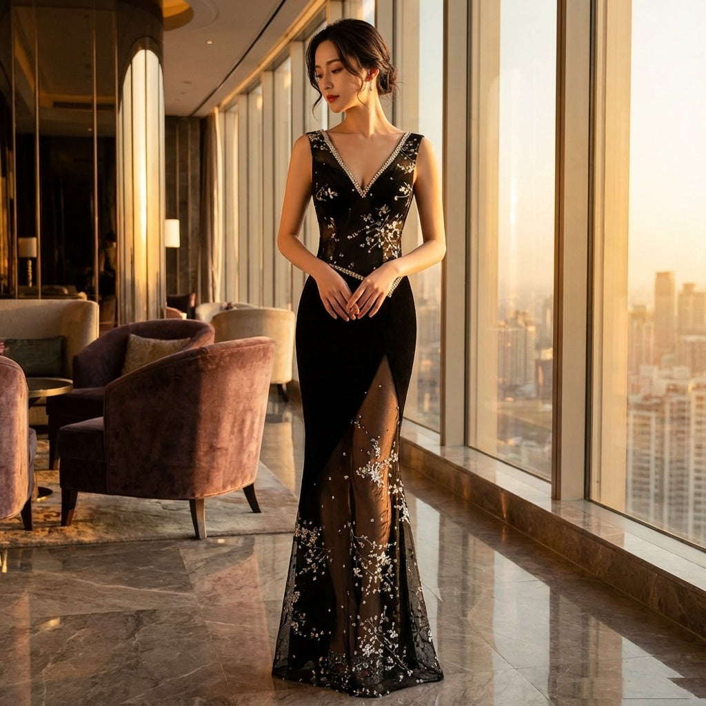 seraph (着丈 サイズオーダー可能) オーダーメイド ブラック マーメイドドレス スリットドレス ロングドレス ノースリーブ ビジュー レース 上質素材 美シルエット 大人女性 夜景 映え ホテル パーティー 特別な夜 (ブラック)XS S M L XL XXL XXXL