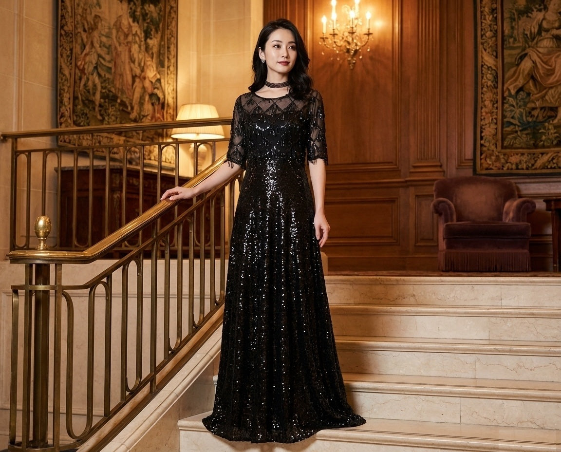 3-763 ロングドレス (着丈 サイズオーダー可能) オーダーメイド Aラインドレス ブラックドレス 長袖ドレス レースドレス スパンコールドレス ビジュードレス フロアレングス クラシックホテル 階段演出 夜景ライティング 重厚 気品 女優的存在感 美シルエット 高級感 特別な夜 結婚式 二次会 演奏会 パーティー フォーマル 日本人女性 (ブラック)XS S M L XL XXL XXXL