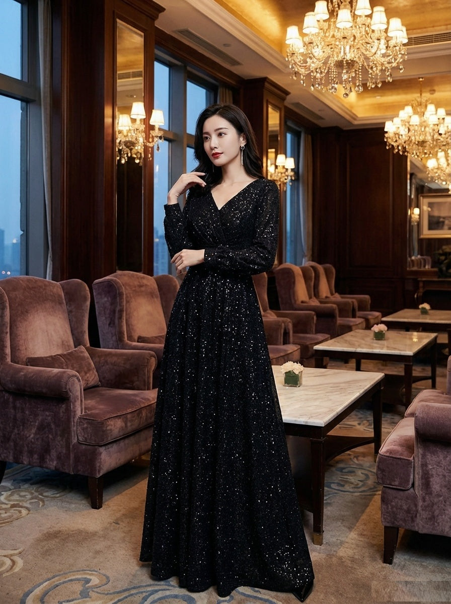 特徴: 長袖・Vネック・ロングドレス・上質素材・光沢感