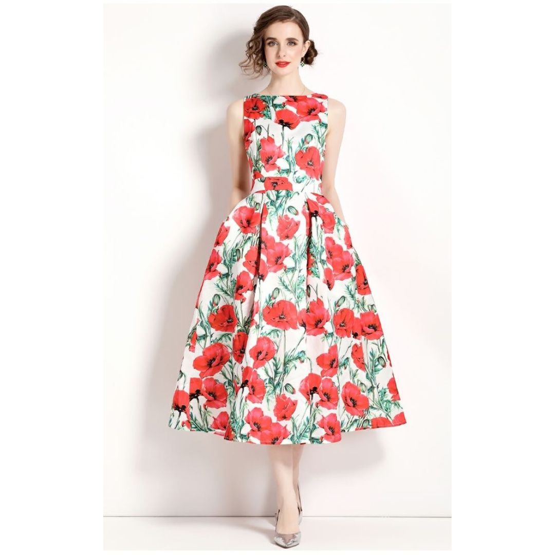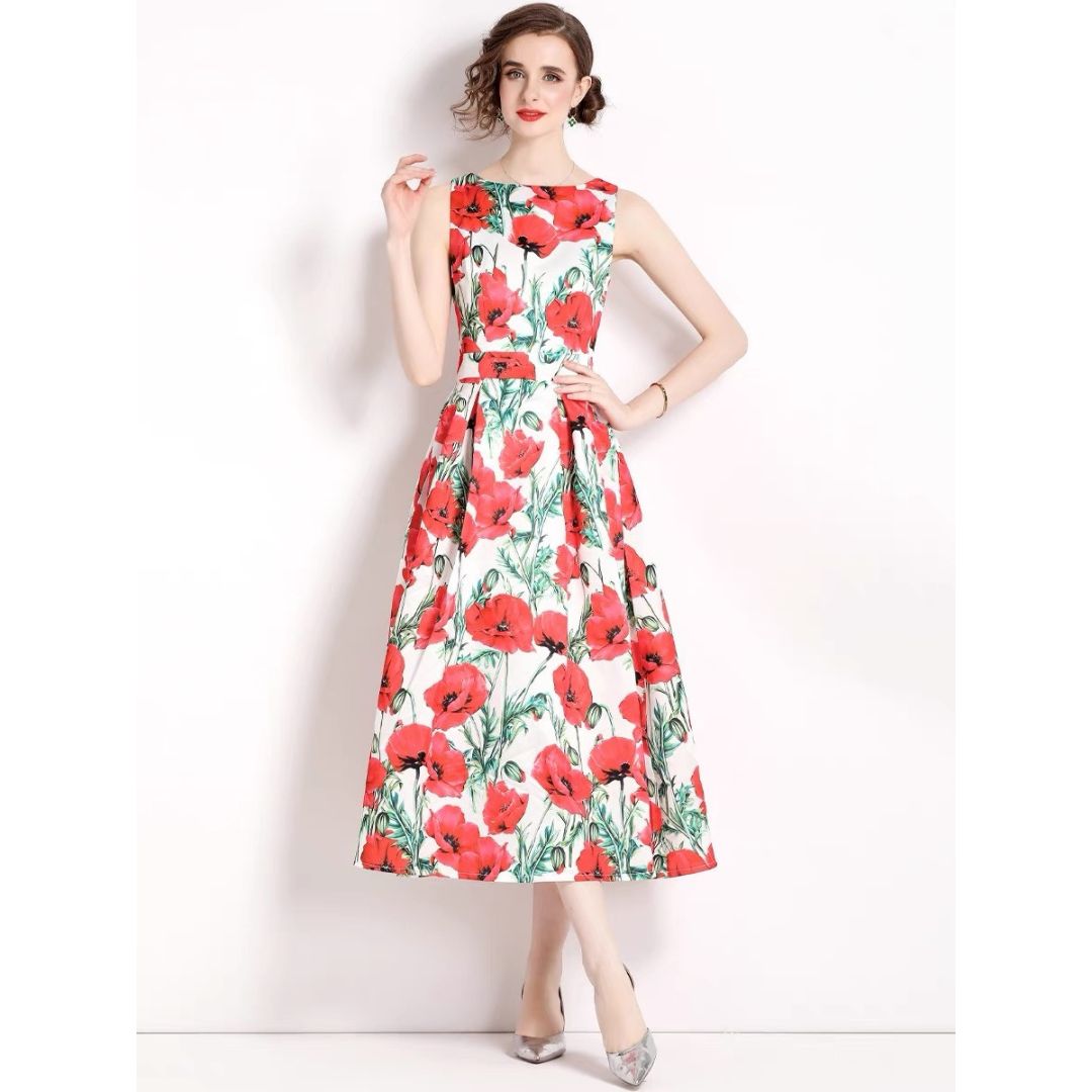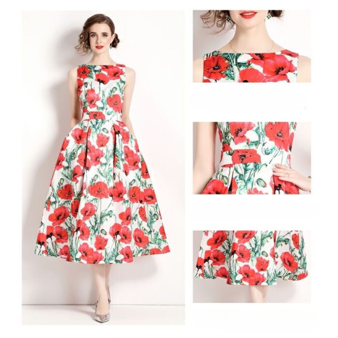 3-jfj7 Aラインドレス (着丈 サイズオーダー可能) オーダーメイド フラワープリントドレス ミディ丈ドレス ノースリーブドレス 美シルエット 上質素材 高級感 透明感 清楚 エレガント 大人上品 揺れ感 日本人女性 ホテルディナー パーティー 結婚式 披露宴 二次会 フォーマル セレモニー プレミアム 華やかさ (ホワイトレッド)