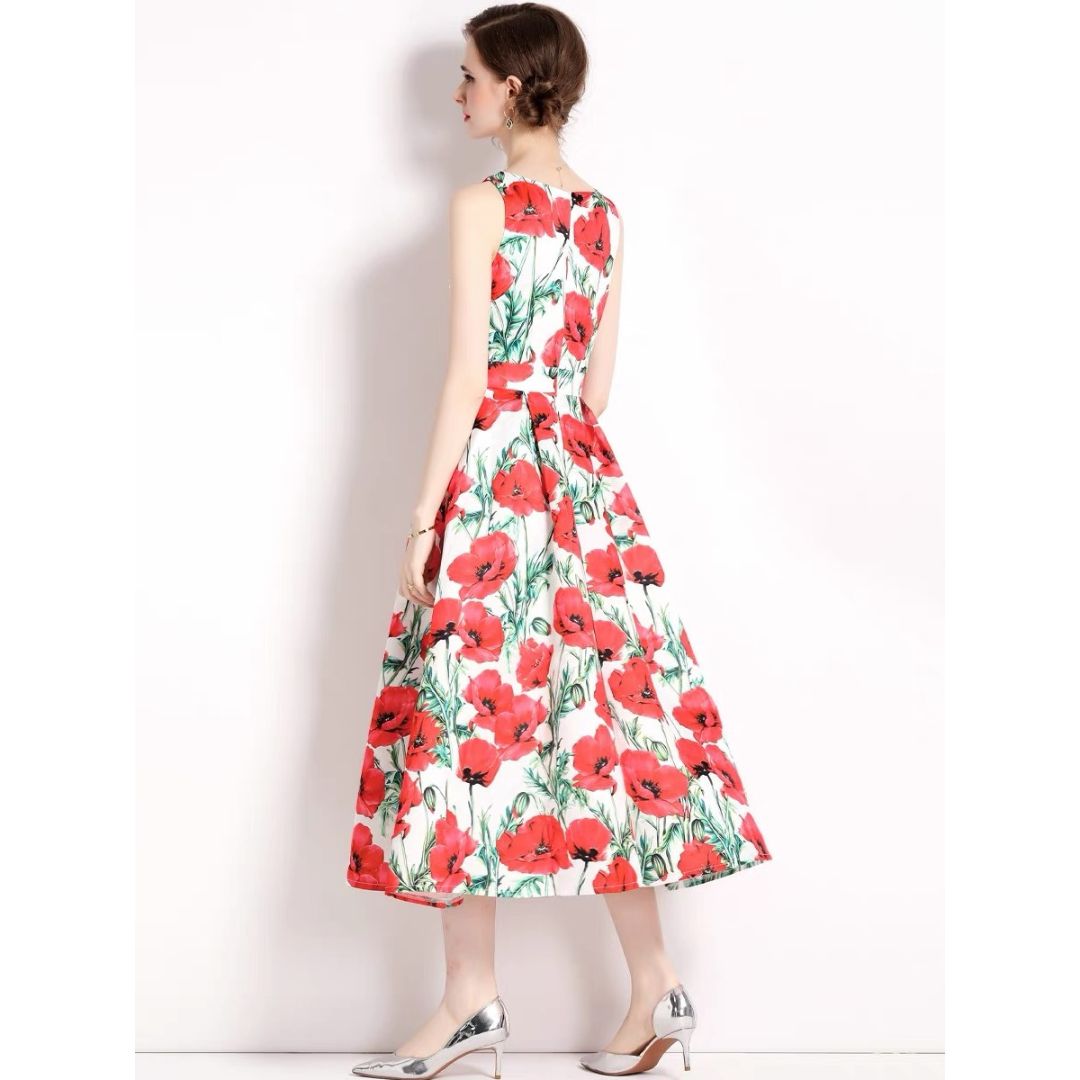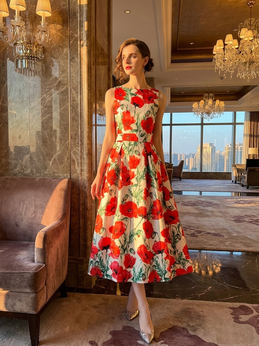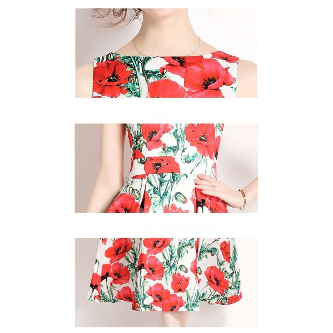 3-jfj7 Aラインドレス (着丈 サイズオーダー可能) オーダーメイド フラワープリントドレス ミディ丈ドレス ノースリーブドレス 美シルエット 上質素材 高級感 透明感 清楚 エレガント 大人上品 揺れ感 日本人女性 ホテルディナー パーティー 結婚式 披露宴 二次会 フォーマル セレモニー プレミアム 華やかさ (ホワイトレッド)