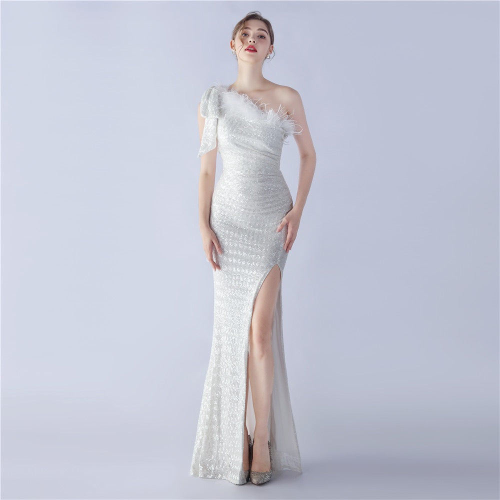特徴: オフショルダー・スリット入り・ロングドレス・上質素材