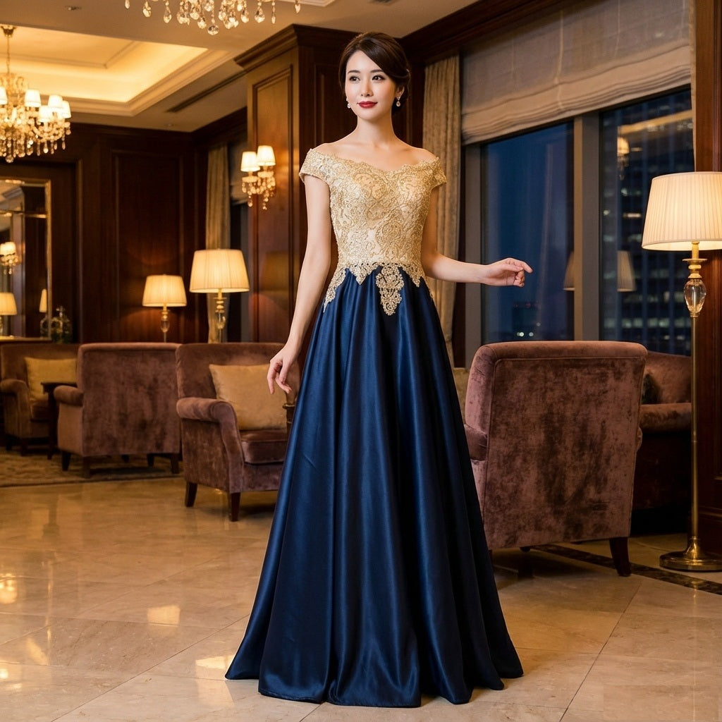 6543-ta Aラインドレス (着丈 サイズオーダー可能) オーダーメイド ロングドレス ネイビー×ゴールドドレス ビジューレーストップス サテンスカート オフショルダー風 体型補整 高級感 ホテルディナー レセプション映え 大人エレガンス (グリーン)