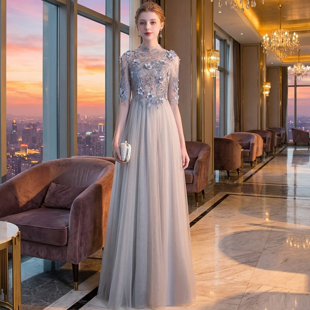 Celina ロングドレス (着丈 サイズオーダー可能) オーダーメイド Aラインドレス パーティードレス フォーマルドレス 高級ドレス ノースリーブドレス グレードレス シフォン素材 透明感 大人女性 ラグジュアリーホテル 大階段 シャンデリア光 柔光ライティング 気品 特別な夜 (グレー)