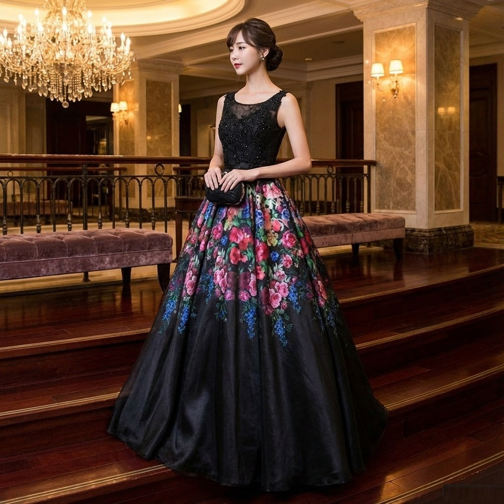 a2101 (着丈 サイズオーダー可能) Aラインドレス ロングドレス ノースリーブドレス オーダーメイド 高級ドレス ブラックドレス フォーマルドレス パーティードレス 結婚式 演奏会 二次会 宮殿ホテル 大階段 シャンデリア フローラル刺繍 ビジュー 上質素材 ボリュームスカート 美シルエット 大人女性 気品 透明感 主役級存在感 日本人女性 (ブラック)XS S M L XL XXL XXXL