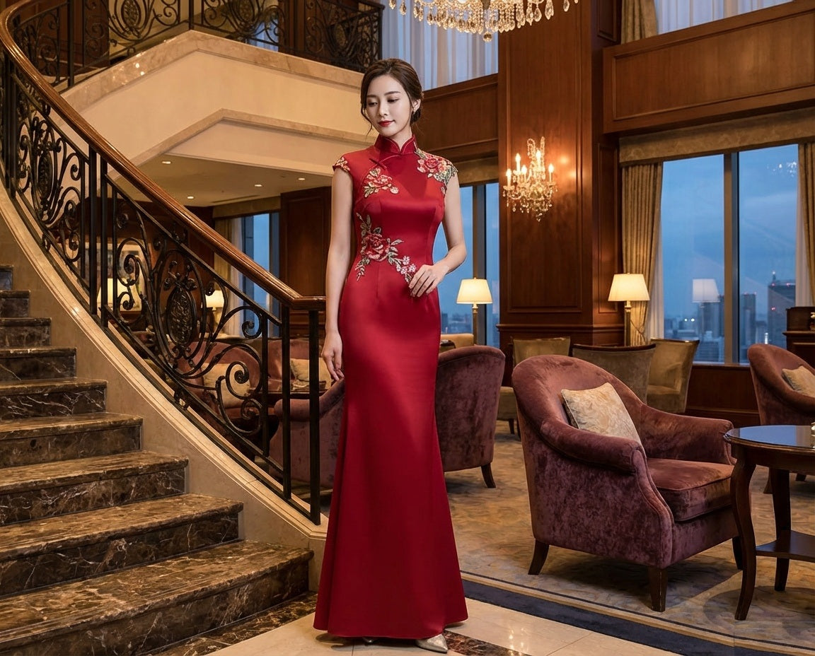 aamu (着丈 サイズオーダー可能) ロングドレス Aラインドレス オーダーメイド 高級ドレス レッドドレス ワインレッドドレス サテンドレス ノースリーブドレス スリットドレス パーティードレス イブニングドレス 演奏会ドレス 発表会ドレス 結婚式 二次会 高級ホテル 大階段 シャンデリア光 気品 官能美 大人の余裕 日本人女性 縦ライン強調 しなやかな歩み 特別な夜 主役級存在感 (レッド)