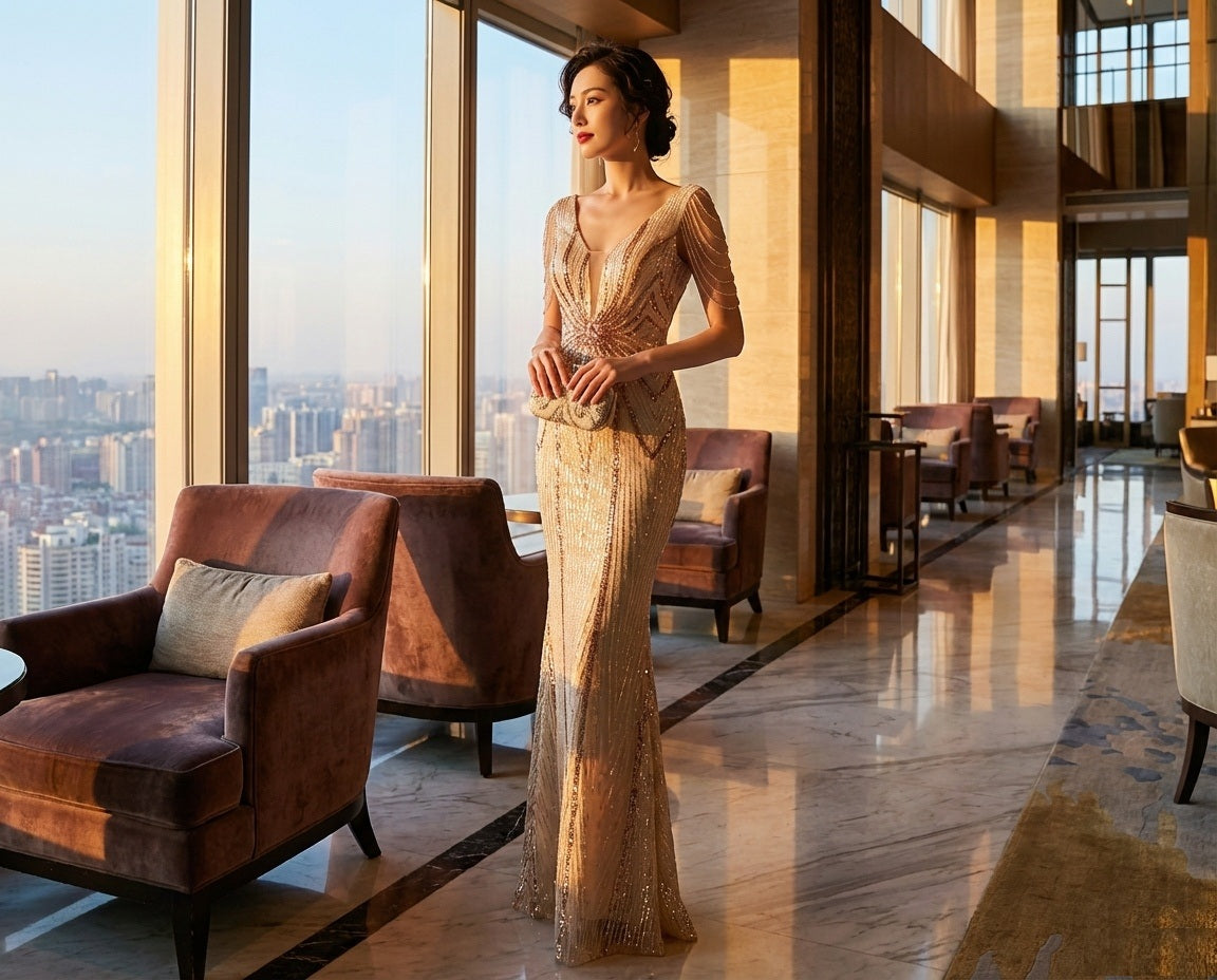 | 🌟 印象表現 | 後ろ姿も映える美しさ、縦長効果、ホテル照明での煌めき、堂々とした大人の華やかさ |