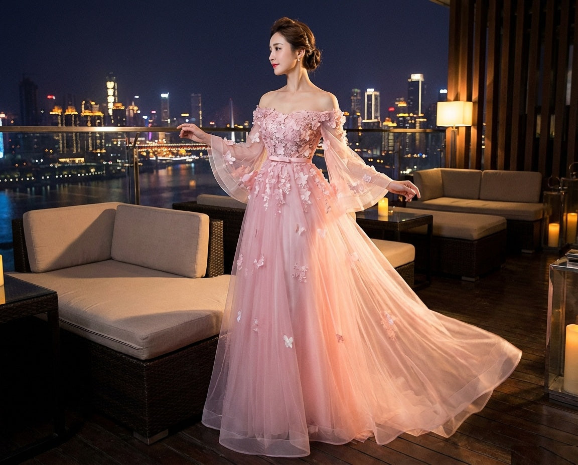 alejandra (着丈 サイズオーダー可能) Aラインドレス ロングドレス オーダーメイド 高級パーティードレス 上質チュール 透明感 ピンク ドレス 長袖シアー スリーブデザイン ウエストマーク 美シルエット 夜景テラス ホテルラグジュアリー 気品 大人女性 特別な夜 記念日 フォーマル 演奏会 主役級 (ピンク)