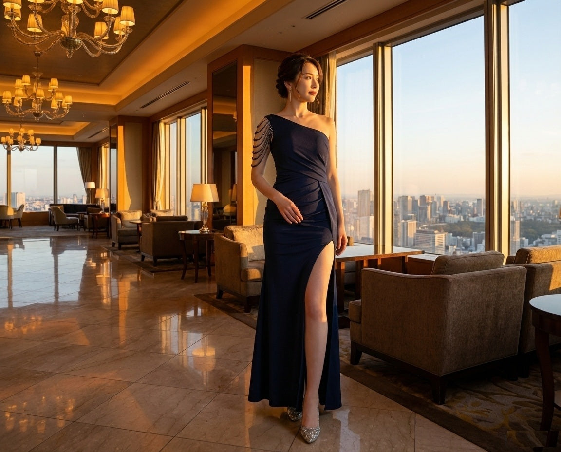 | 💎 ディテール | ワンショルダーデザイン、チェーン状アームアクセント、美脚を強調する深めスリット、バックファスナー仕様 |