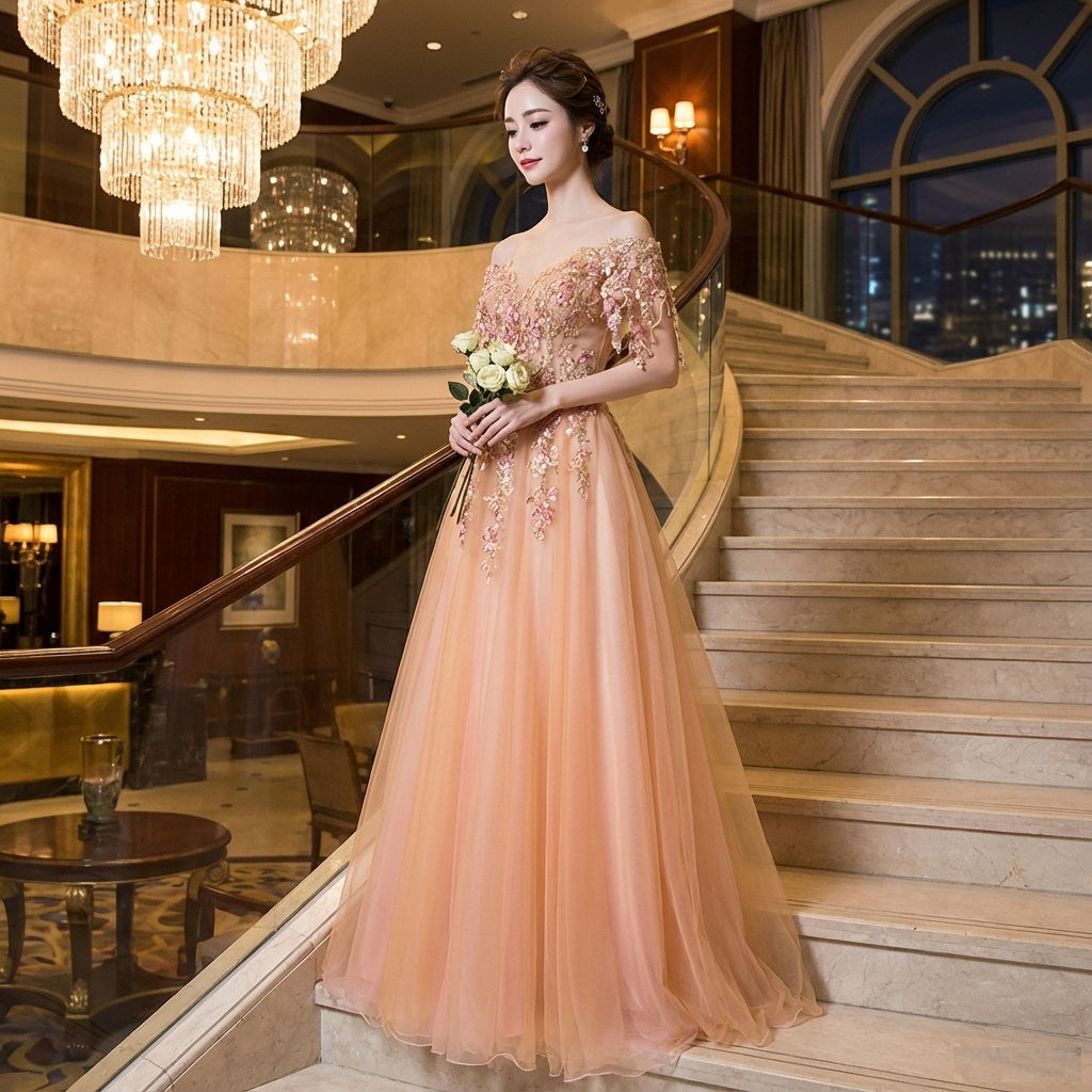 ayrault (着丈 サイズオーダー可能) オーダーメイド Aラインドレス ロングドレス チュールドレス ノースリーブドレス アプリコットドレス フォーマルドレス 上質素材 エアリーチュール ソフトカラー 透明感 気品 美シルエット 柔らかな光 幸福感 大人女性 正装 結婚式 披露宴 演奏会 晩餐会 パーティー 高級感 日本人女性向け (ゴールド)XS S M L XL XXL XXXL