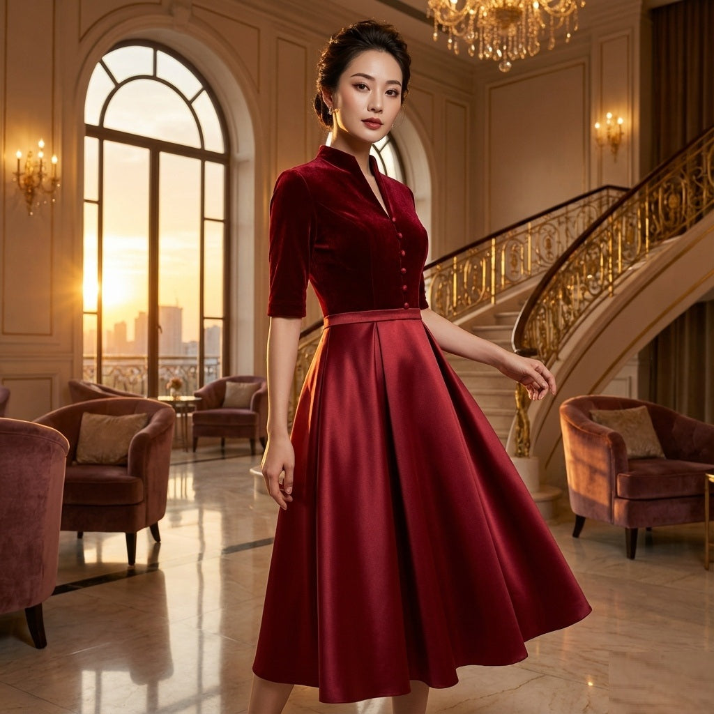 dagn (着丈 サイズオーダー可能) オーダーメイド Aラインドレス ロングドレス レッドドレス ノースリーブドレス フォーマルドレス 上質素材 ディープレッド ボリュームスカート フレアシルエット クラシック階段 建築美 自然光 気品 主役級 華やぎ 大人女性 正装 結婚式 披露宴 演奏会 晩餐会 パーティー 高級感 日本人女性向け (レッド)XS S M L XL XXL XXXL