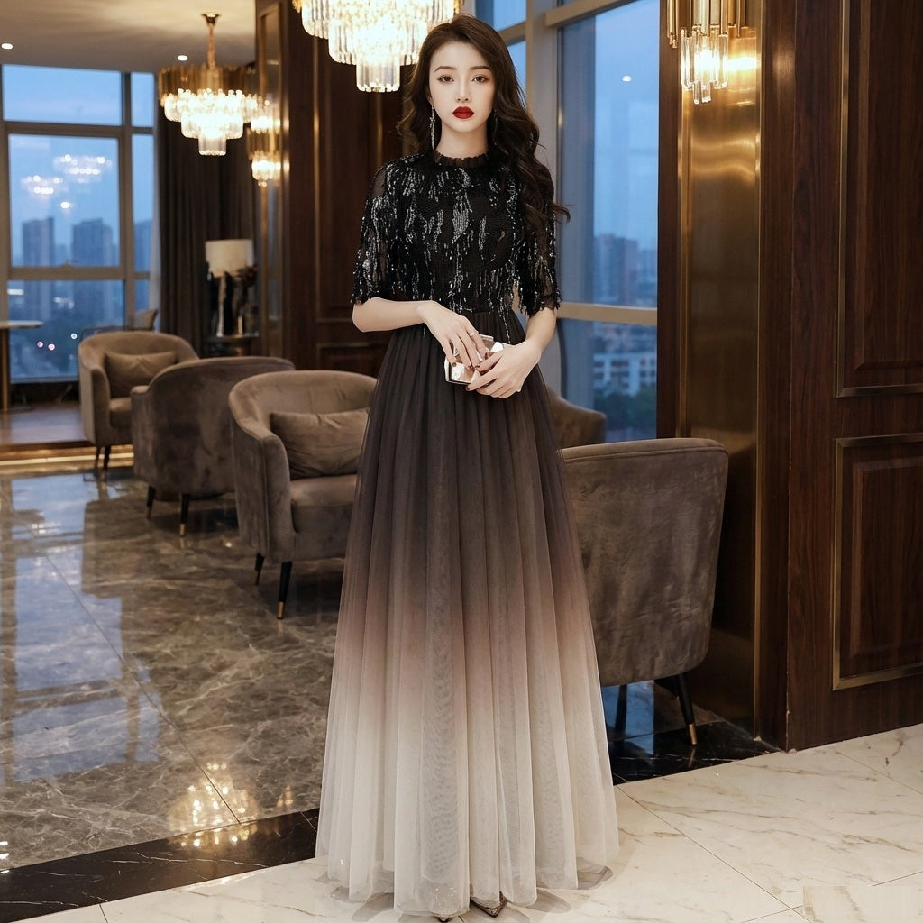eleonoorat (着丈 サイズオーダー可能) Aラインドレス ロングドレス ノースリーブドレス オーダーメイド 高級ドレス グレードレス フォーマルドレス パーティードレス 結婚式 演奏会 二次会 高級ホテル ロビー シャンデリア レース チュール グラデーション 上質素材 美シルエット 大人女性 気品 透明感 知的エレガンス 主役級存在感 日本人女性 (グレー)XS S M L XL XXL XXXL