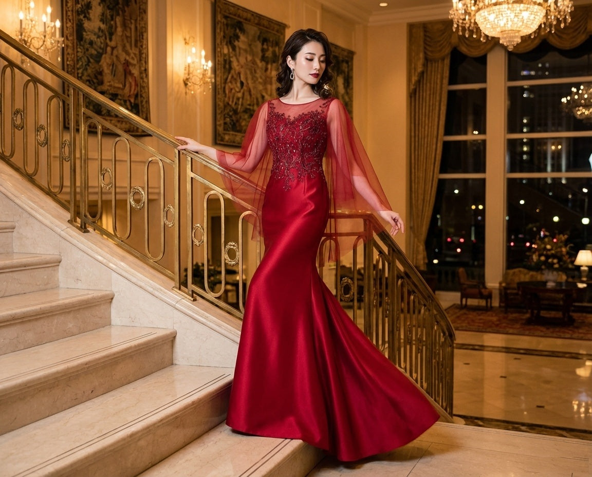 eloi (着丈 サイズオーダー可能) オーダーメイド マーメイドドレス ロングドレス レースドレス スリットドレス レッドドレス フォーマルドレス 上質素材 シアースリーブ ボディライン強調 美シルエット トレーン演出 スタジオ背景 柔光ライティング 気品 色香 大人女性 正装 結婚式 披露宴 演奏会 晩餐会 パーティー 高級感 日本人女性向け (レッド)XS S M L XL XXL XXXL