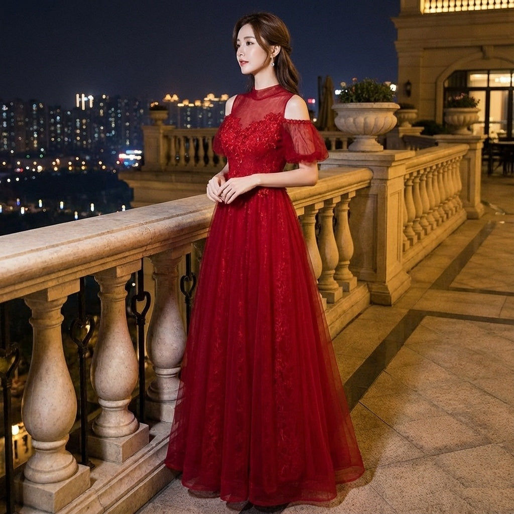 gilles Aラインドレス (着丈 サイズオーダー可能) オーダーメイド ロングドレス レッド シフォン チュール ノースリーブ フレアシルエット 体型カバー 縦ライン美 細見え 気品 華やぎ 大人の余裕 ホテル階段 シャンデリア光 特別な夜 晩餐会 演奏会 パーティー 主役級ラグジュアリードレス (レッド)XS S M L XL XXL XXXL