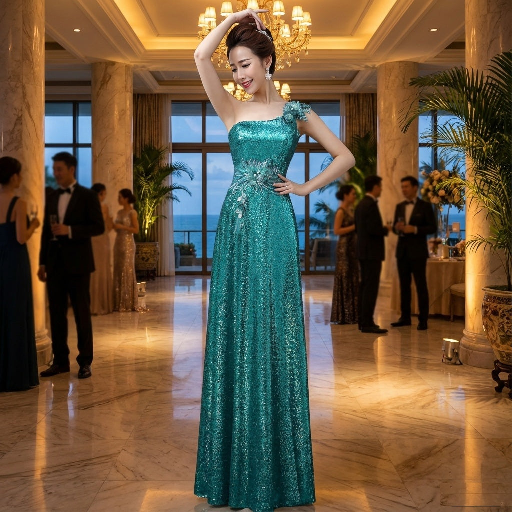 goldfishgold スパンコールドレス (着丈 サイズオーダー可能) オーダーメイド ロングドレス ワンショルダードレス フラワーモチーフ Aラインシルエット 体型補整 美シルエット 高級感 上質素材 透明感 大人上品 ホテルパーティー 特別な夜 (グリーン)