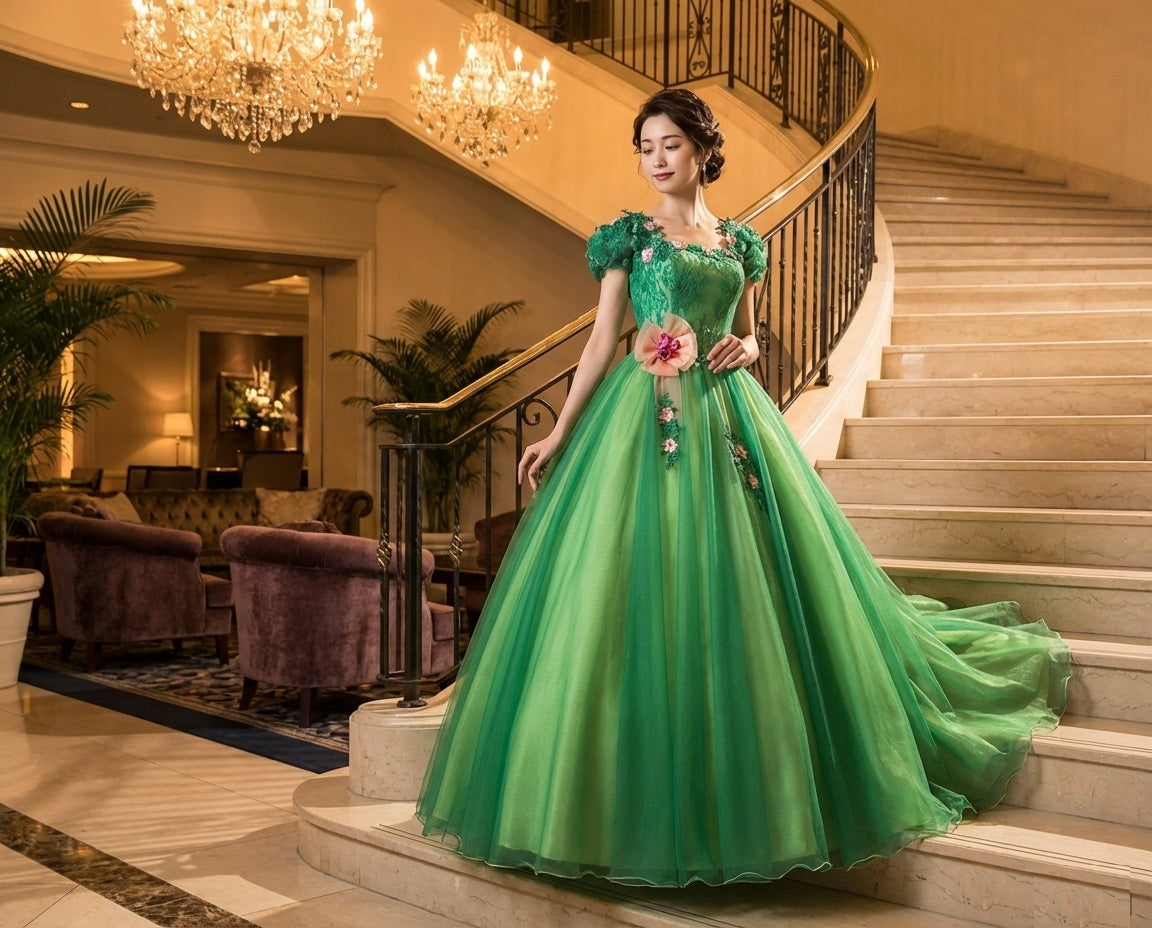guido Aラインドレス (着丈 サイズオーダー可能) オーダーメイド ロングドレス グリーン エメラルド サテン チュール ノースリーブ ビジュー ウエストマーク フレアシルエット 体型カバー 縦ライン美 気品 華やぎ ホテル大階段 シャンデリア光 特別な夜 晩餐会 演奏会 主役級ラグジュアリードレス (グリーン)XS S M L XL XXL XXXL
