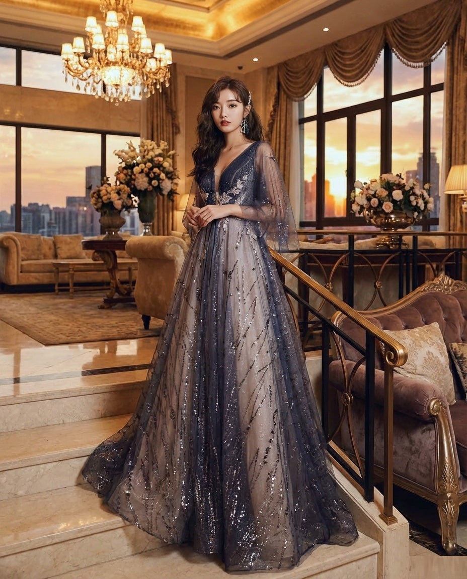 Valeria オーダーメイド Aラインドレス ロングドレス シアースリーブ 星影ビジュー ミステリアスエレガンス (ダークグレー)