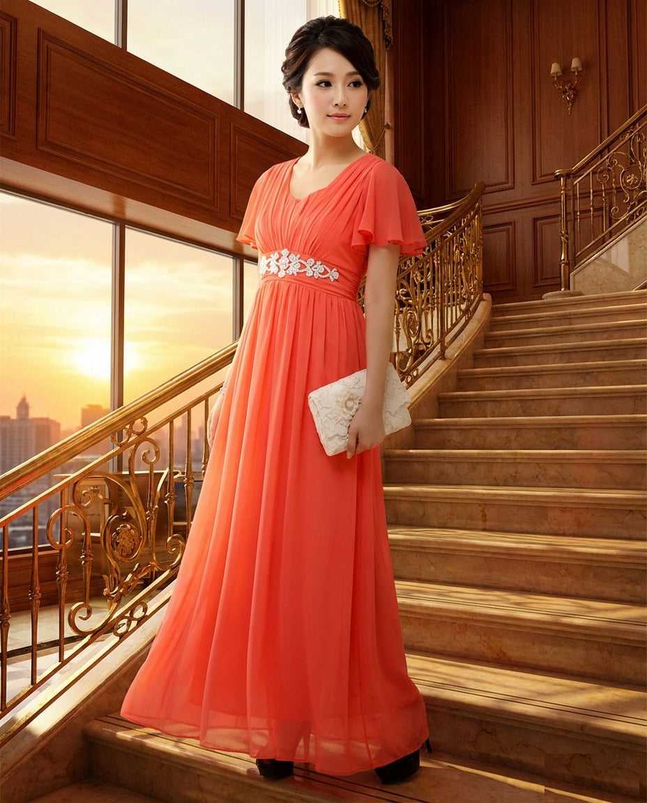 lerner Aラインドレス (着丈 サイズオーダー可能) オーダーメイド ロングドレス 半袖ドレス レッドドレス コーラルレッド シフォン チュール ウエストビジュー 刺繍 上質素材 高級感 気品 透明感 フェミニン 大人の余裕 静かな美しさ クラシックホテル 大階段 サンセット ゴールデンアワー シャンデリア 光演出 立体シルエット 体型補正 フォーマル 晩餐会 特別な夜 (オレンジ)