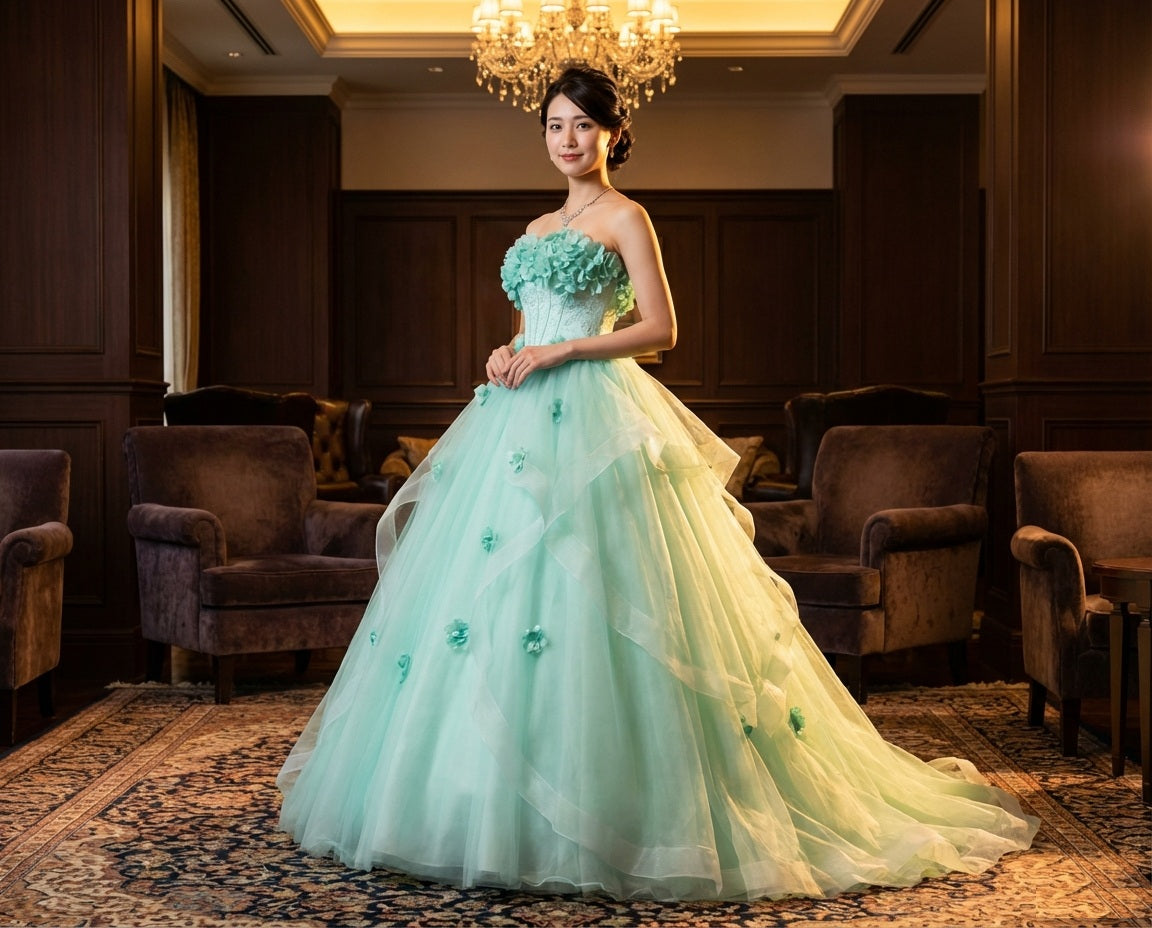 アルカドレスは、職人が一点一点真心を込めて丁寧に制作いたします。その想いは素材選びから縫製、装飾まで、すべての工程に宿ります。世界に一つだけの特別な一着を、ぜひご自身の目で、肌で感じてください。また、追加料金1,500円で、丈の長さ・胸囲・ウエストなど、お客様のサイズに合わせたオーダーメイドも承っております。